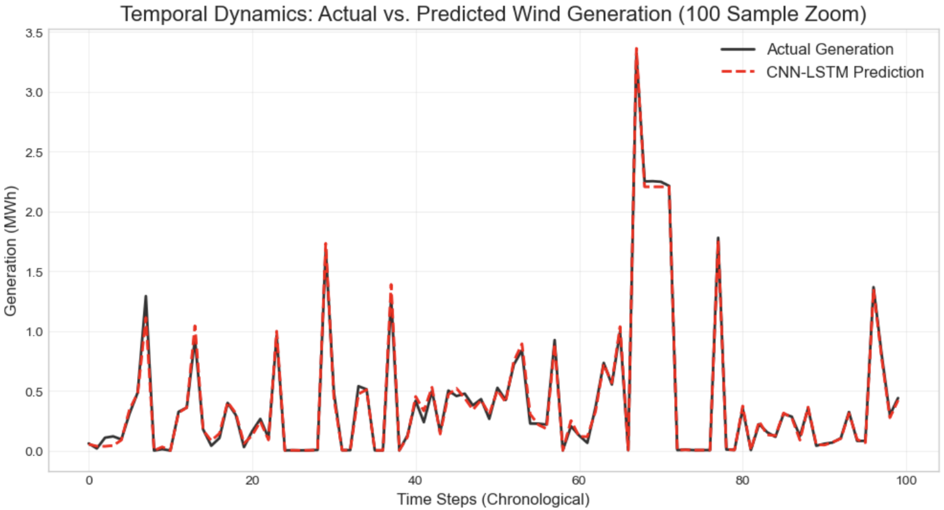 Temporal Dynamics: A zoom of Actual vs. Predicted Wind Generation. The model accurately captures the volatility and intermittency inherent in wind power.