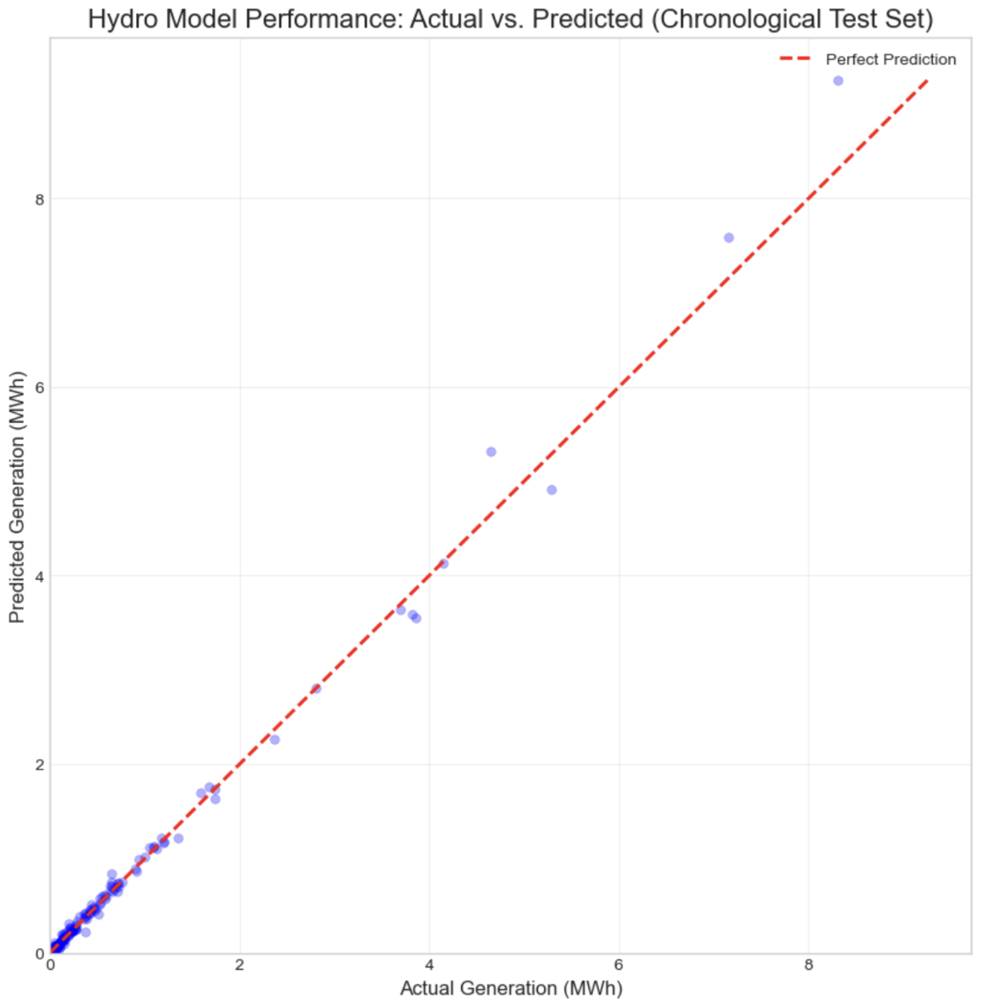 Actual vs. Predicted hydro power generation. The close correlation demonstrates the model’s effectiveness even on the smallest data subset.