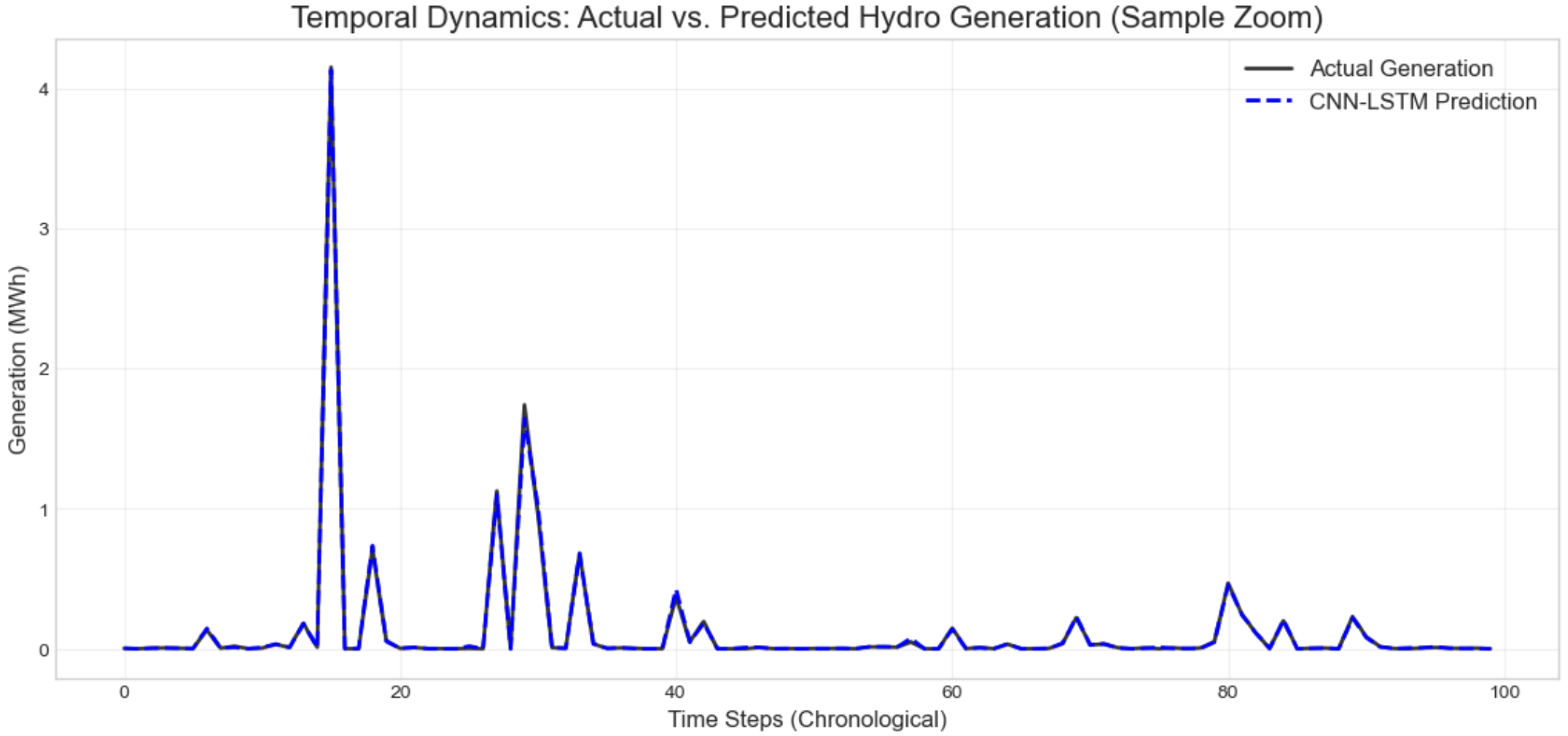 Temporal Dynamics: A zoom of Actual vs. Predicted Hydro Generation. The model accurately captures the timing of generation spikes driven by precipitation events.