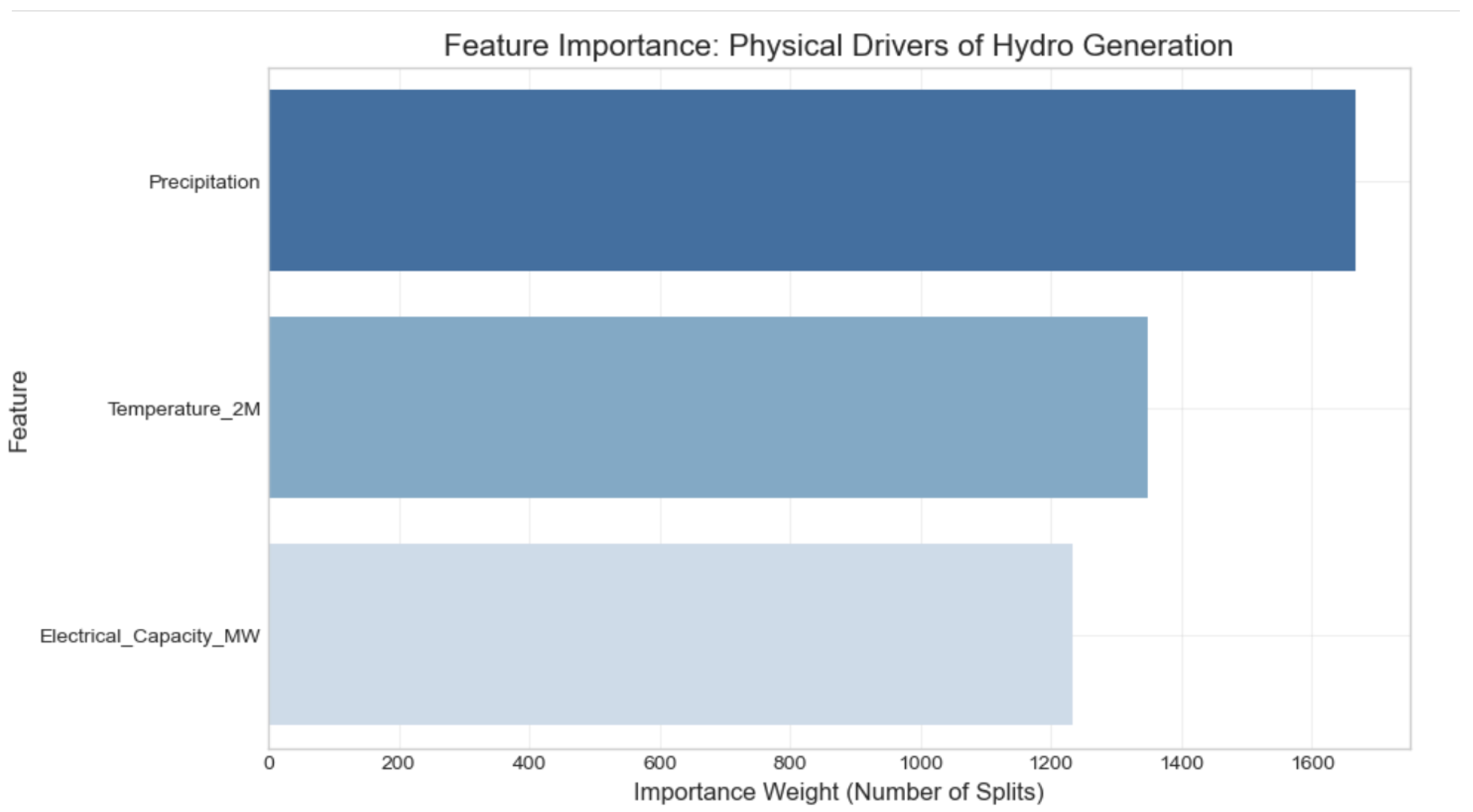 Feature Importance analysis for Hydro Generation. Precipitation is correctly identified as the dominant driver, validating the model’s physical interpretability.