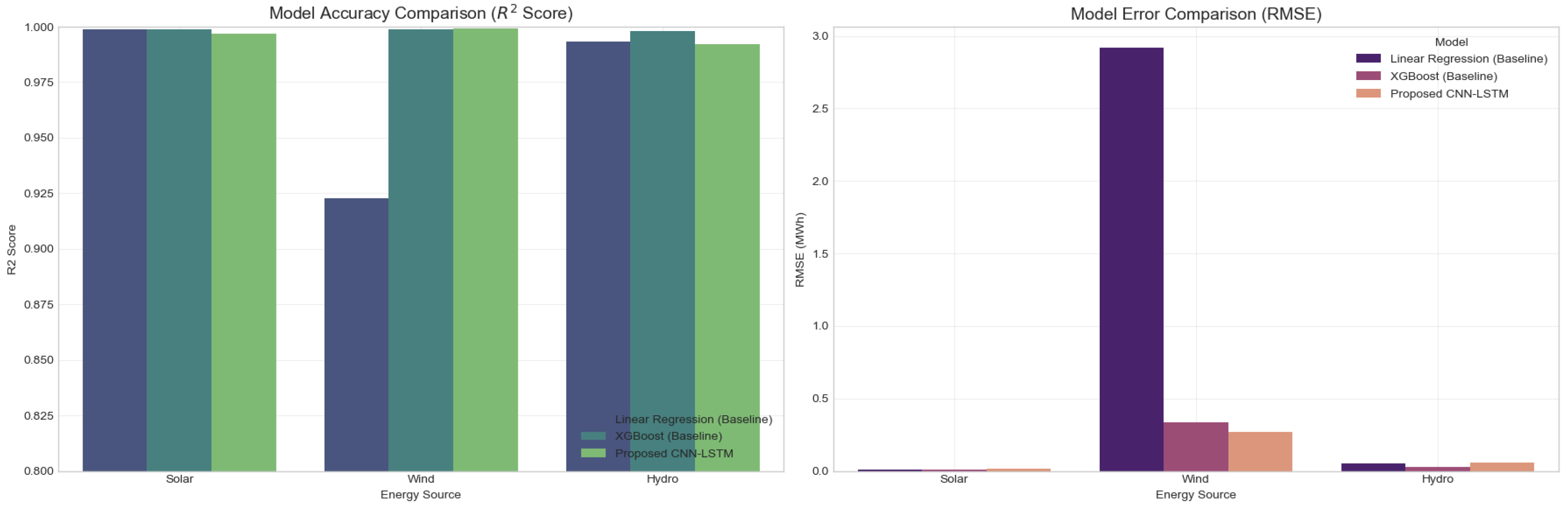 Model Accuracy () and Error (RMSE) comparison across all energy sources. The proposed CNN-LSTM model (green bar) demonstrates consistent high performance, matching baselines in linear tasks and surpassing them in complex non-linear tasks (Wind).