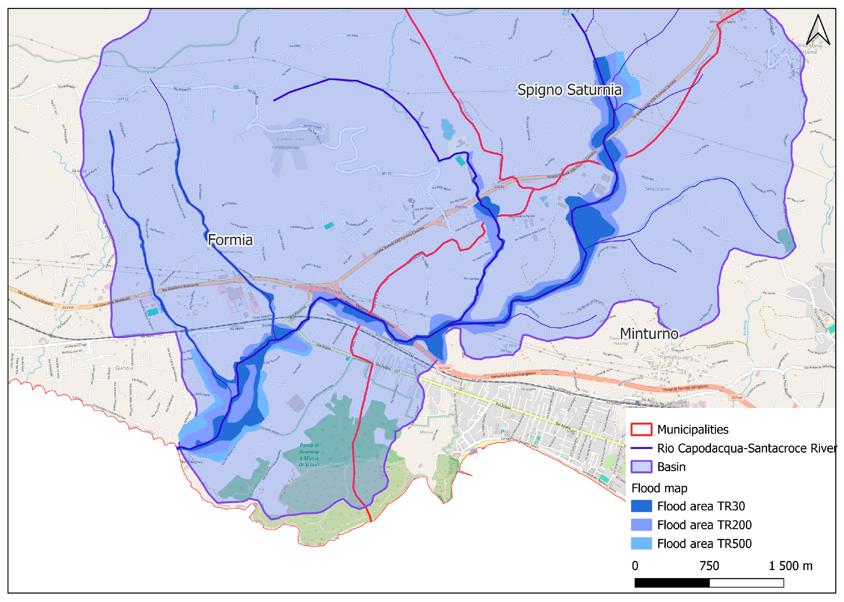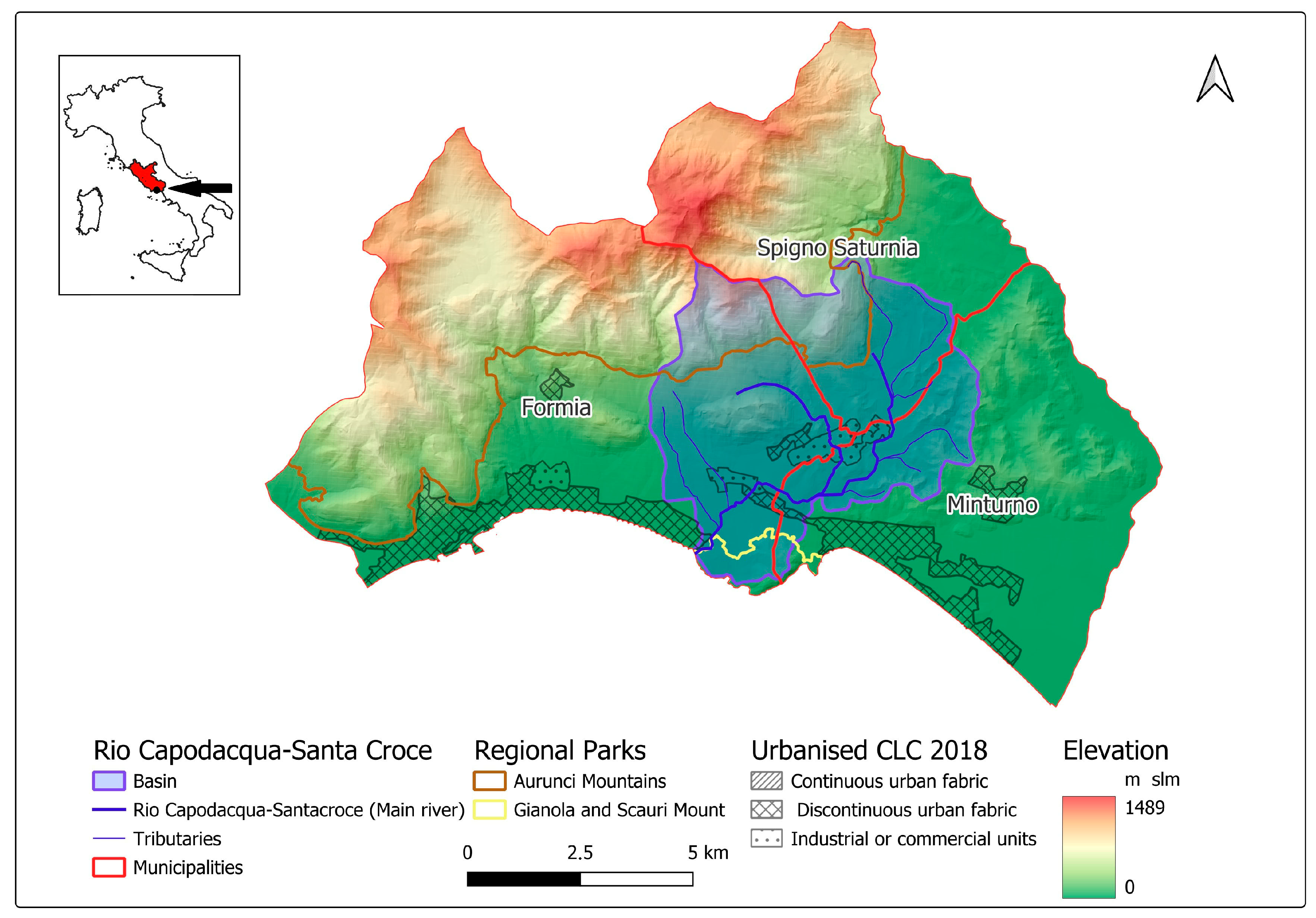 The Rio Capodacqua—Santa Croce river basin is located in central Italy, more precisely between the Aurunci Mountains, Mesozoic limestone hills belonging to the Apennine chain, and the Tyrrhenian Sea, where the main river flows into. Its main sources are at 87 m above sea level on the slopes of the aforementioned mountains, from where the waters flow for almost 11 km to the mouth. The basin covers over 35 sq km and involves three municipalities: Formia, Minturno and Spigno Saturnia in the Lazio Region. Although the upper parts of the basin are over 1000 m above sea level, it mostly extends within the Quaternary alluvial deposits of a coastal plain [