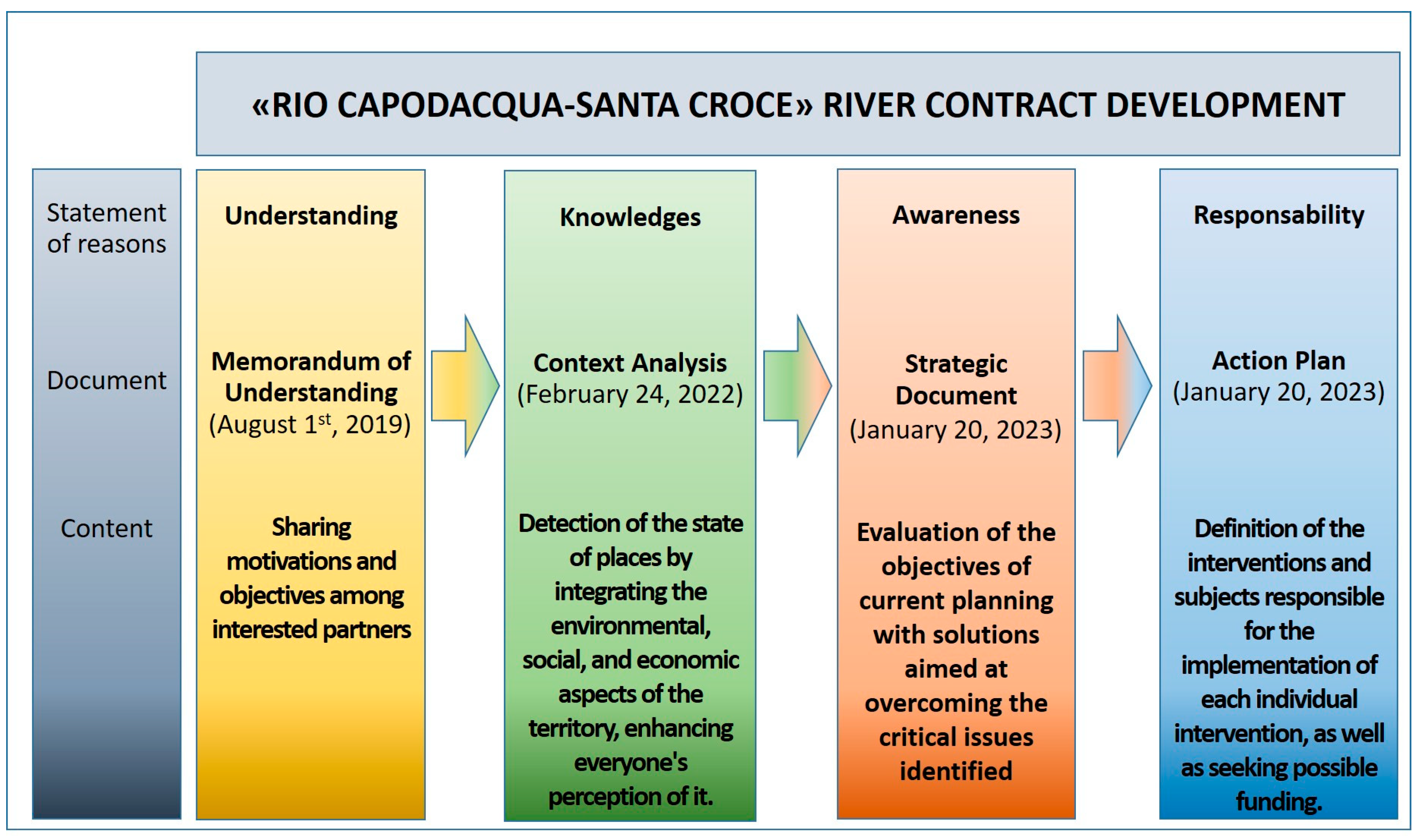 28]. Ensuring the integration of every aspect is not always easy, nor is it immediately applicable in some cases. For this reason, the River Contract tool can represent a solution, or rather an extraordinary opportunity for development for any territory crossed by a watercourse, regardless of its size. The chances of success are very high, as every action, from its definition to its implementation, will involve citizens, including organised groups, professionals, administrators and stakeholders, all motivated to resolve the environmental and territorial issues emerging in what is considered their home territory. Therefore, being able to directly witness the definition and implementation of responses within a well-defined and limited time frame can bring each of these individuals closer to the river, for which they will all feel responsible. Furthermore, sharing decisions at a local level can “raise” the value of water as a resource and make it possible to pay greater attention to its use for the well-being of people and the protection of the environment [