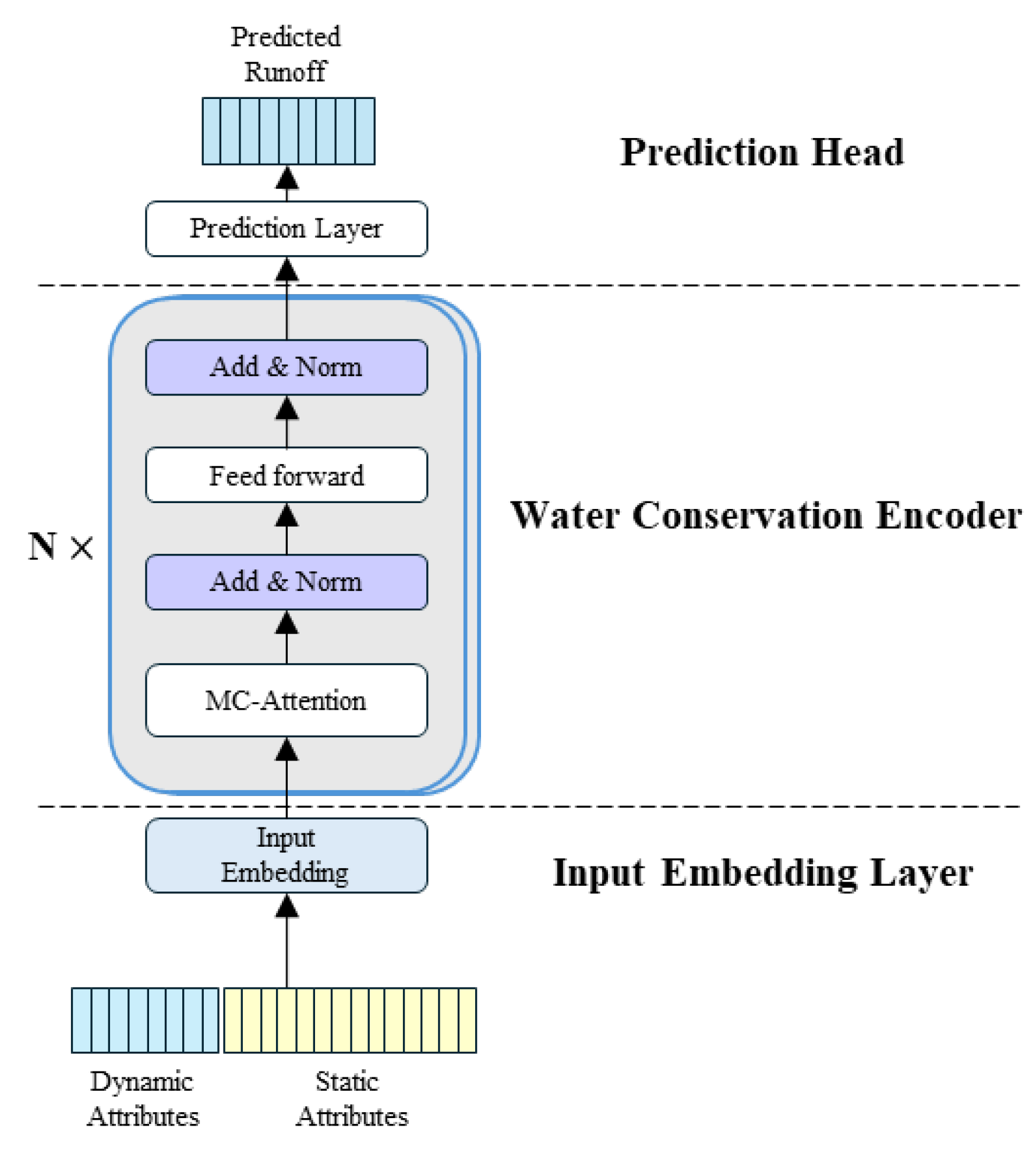 We propose a Transformer-based regional rainfall–runoff model, named MC-former, whose architecture consists of an input embedding layer, a physics-constrained Transformer encoder, and a regression prediction head, as illustrated in