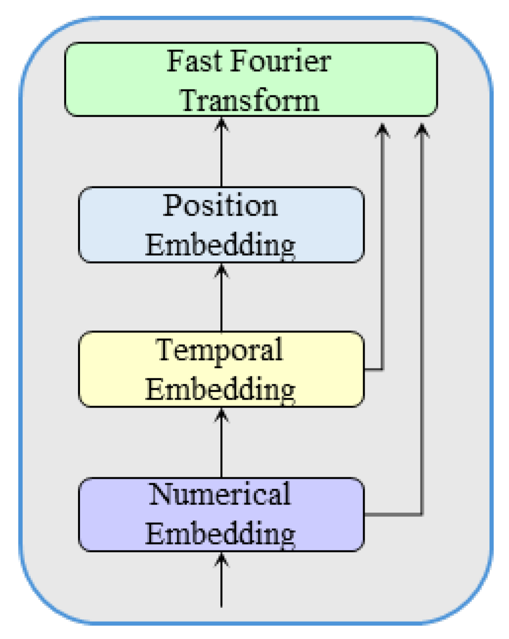 The input embedding layer generates a comprehensive embedding representation for time series data, combining original numerical features, temporal features, and positional information. The input embedding layer structure is shown in