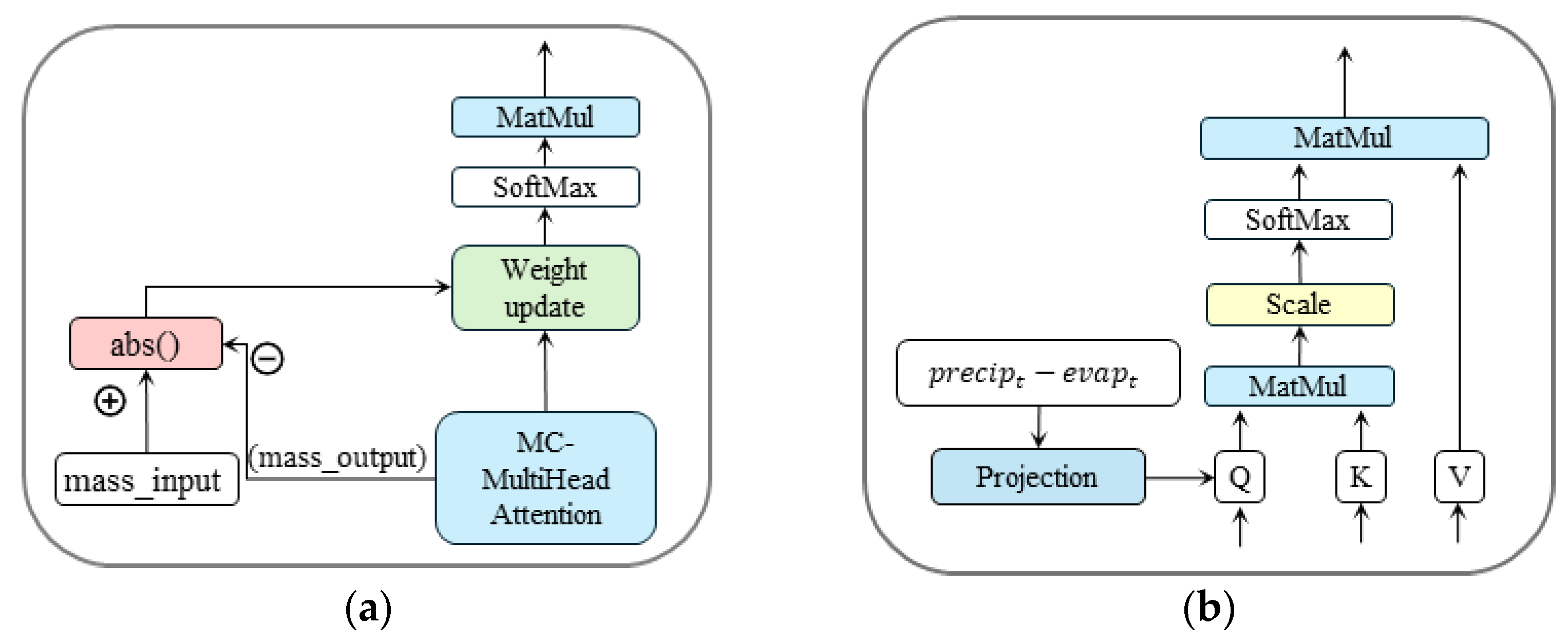 We define MC-attention (mass conserving attention) as a modified self-attention mechanism in which cumulative water input and a layer-wise mass-tracking state are explicitly tracked, and their discrepancy is used to bias attention weights toward physically consistent aggregation.