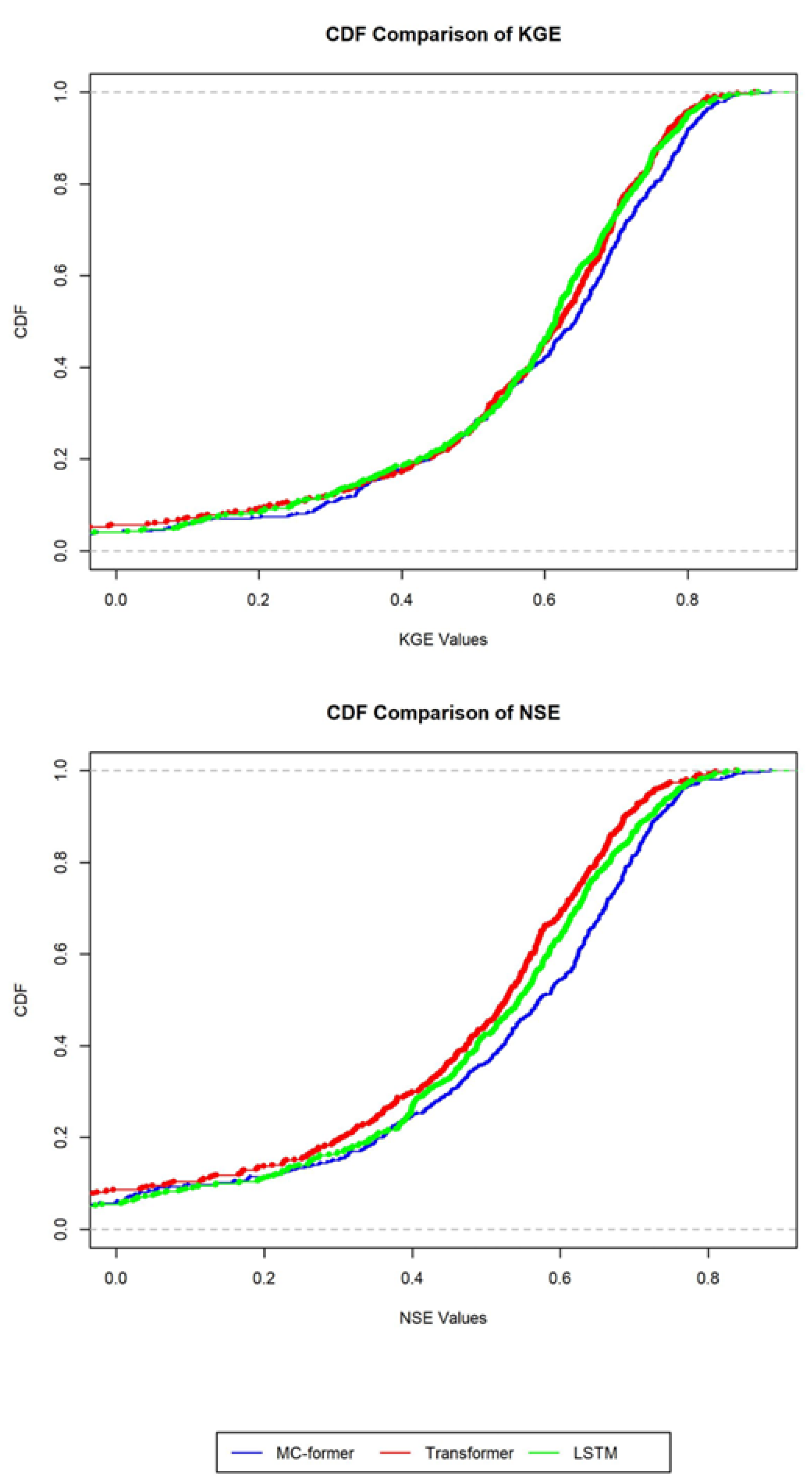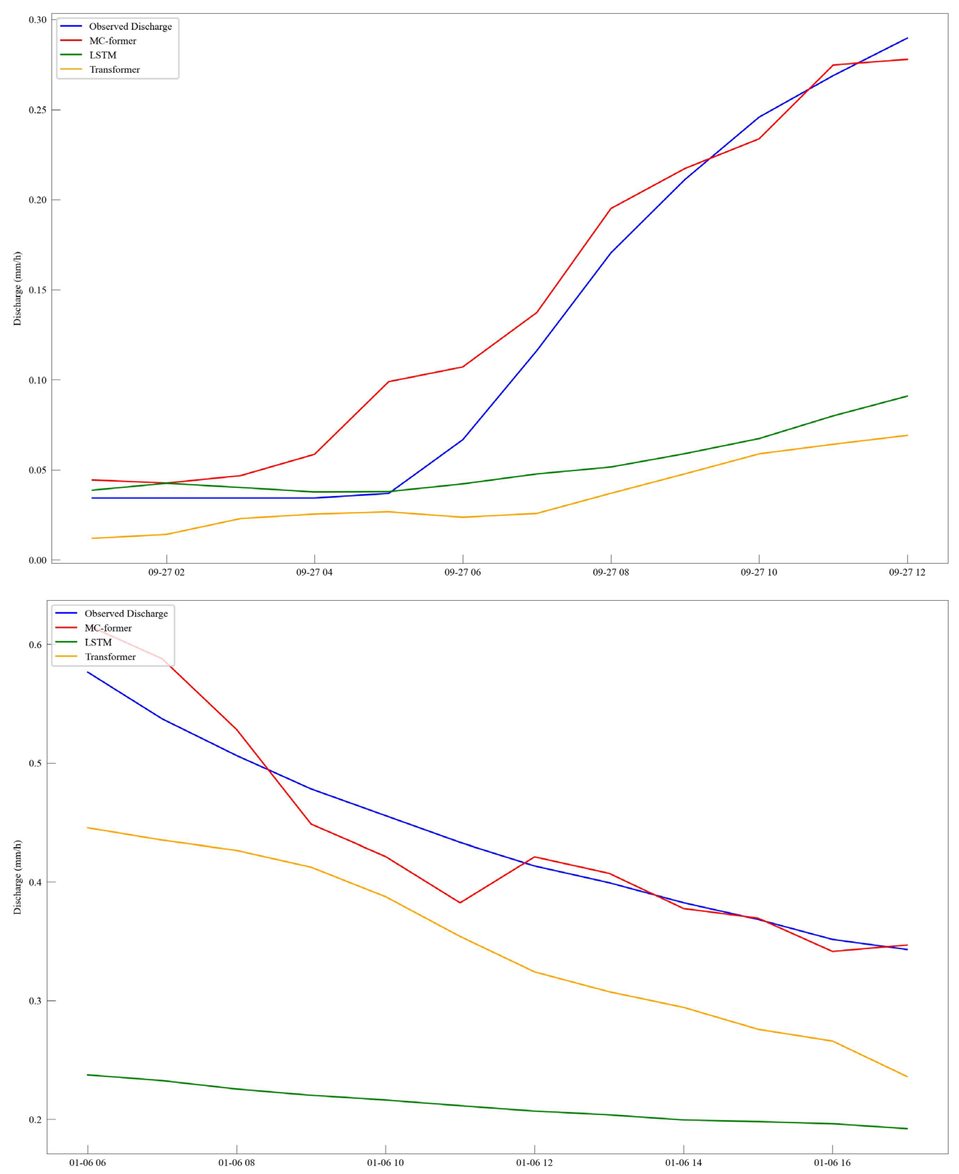 24] as baseline models to compare with our proposed model. All baseline models were reimplemented/retrained under the same experimental setup and data splits as MC-former (training/validation/test), rather than using published performance values. Both baseline models also use static watershed variables for computation; in other words, the baseline models also have regional runoff prediction capabilities. The hyperparameter values for the baseline models follow the specifications in their respective papers, while other training settings (e.g., input window, optimizer, and early-stopping criterion) are kept consistent across models whenever applicable to ensure a fair comparison.