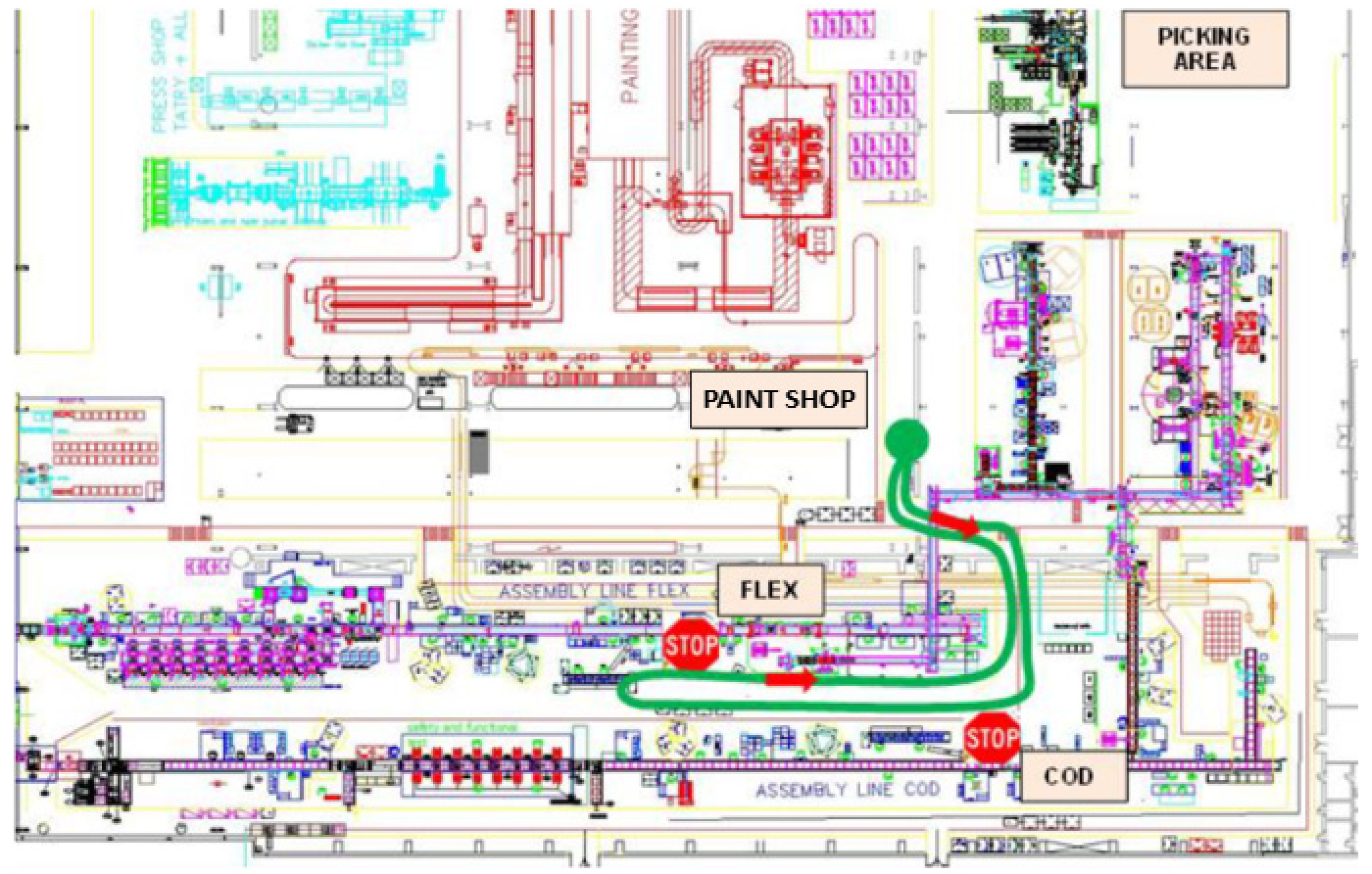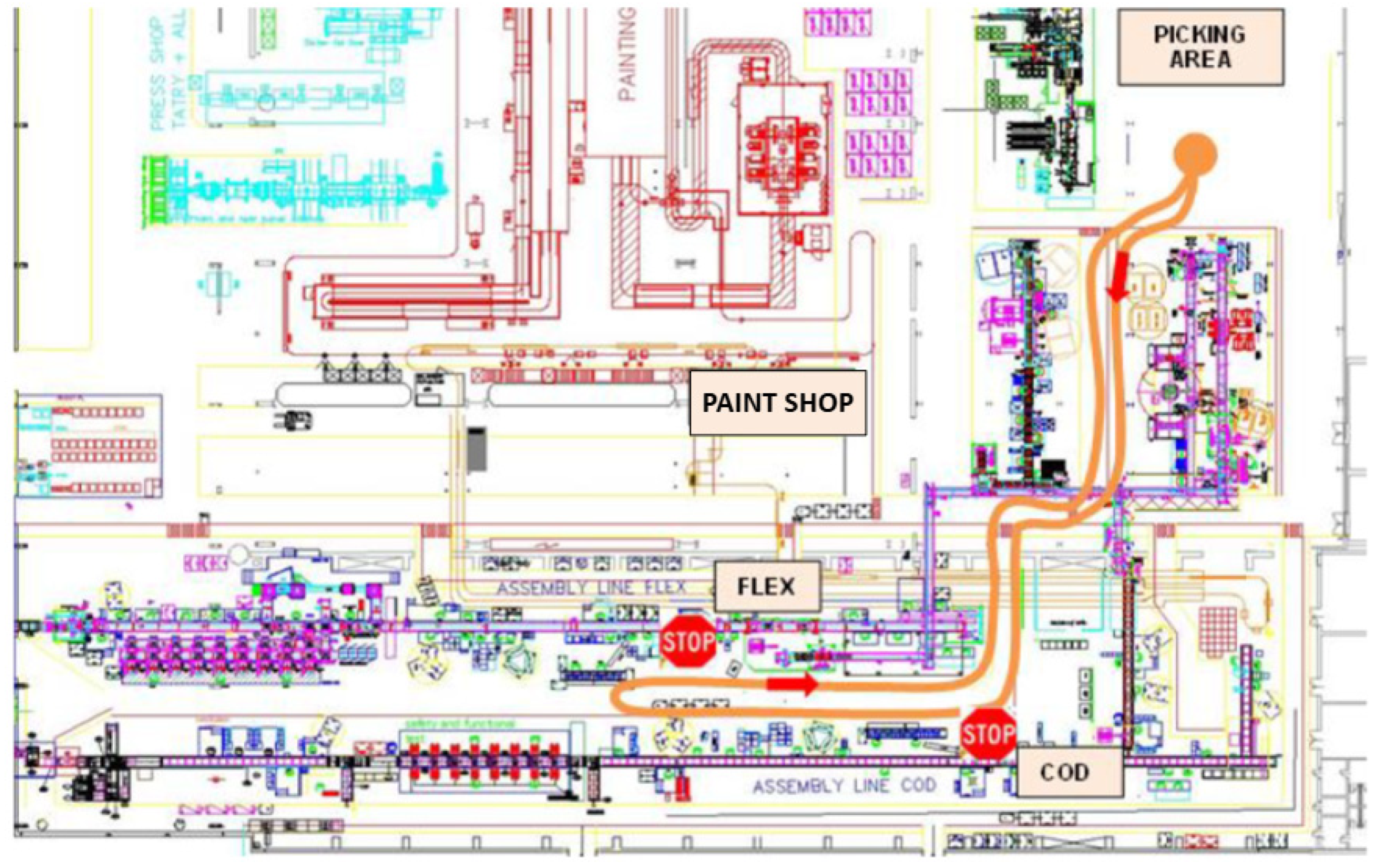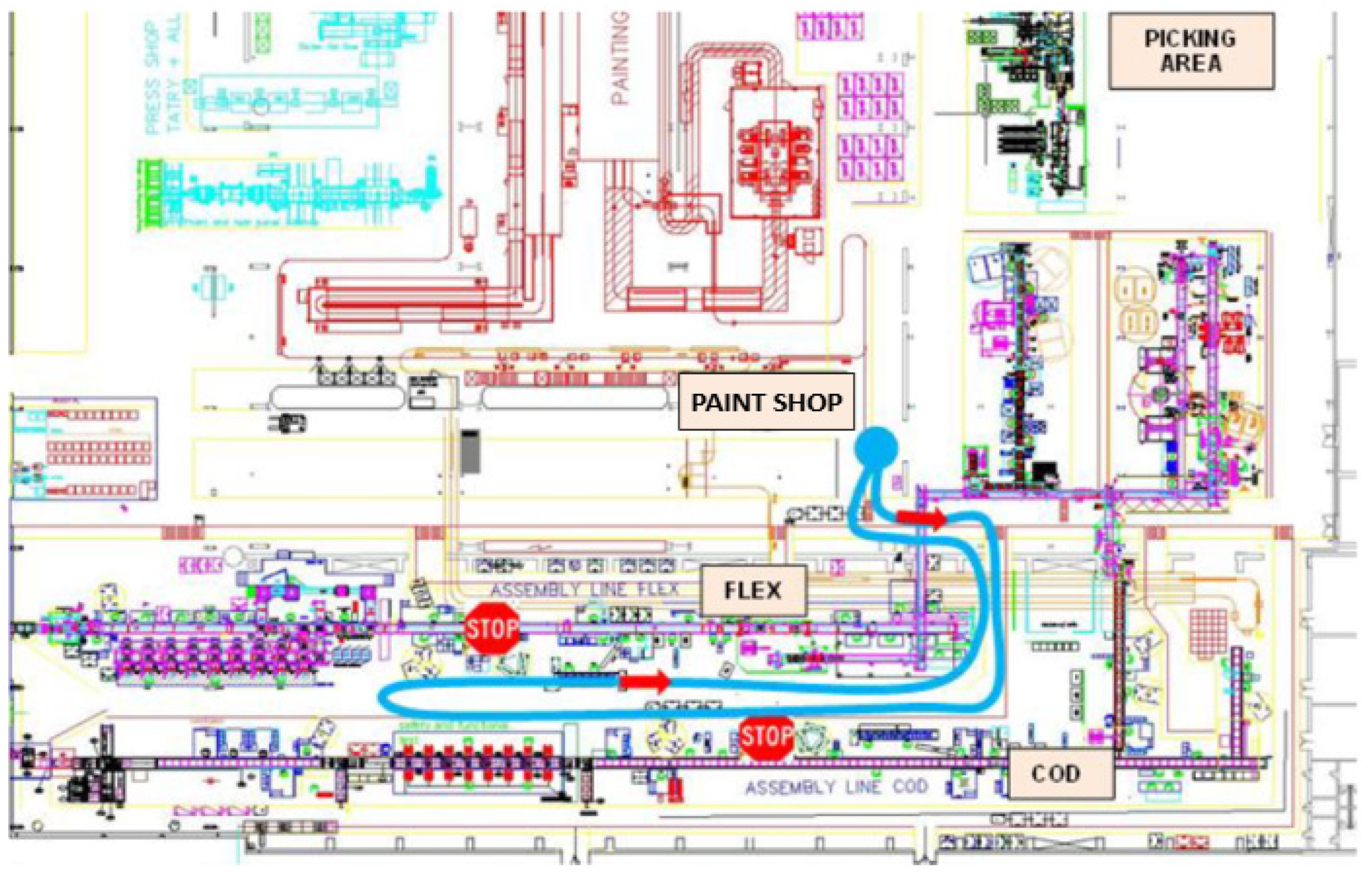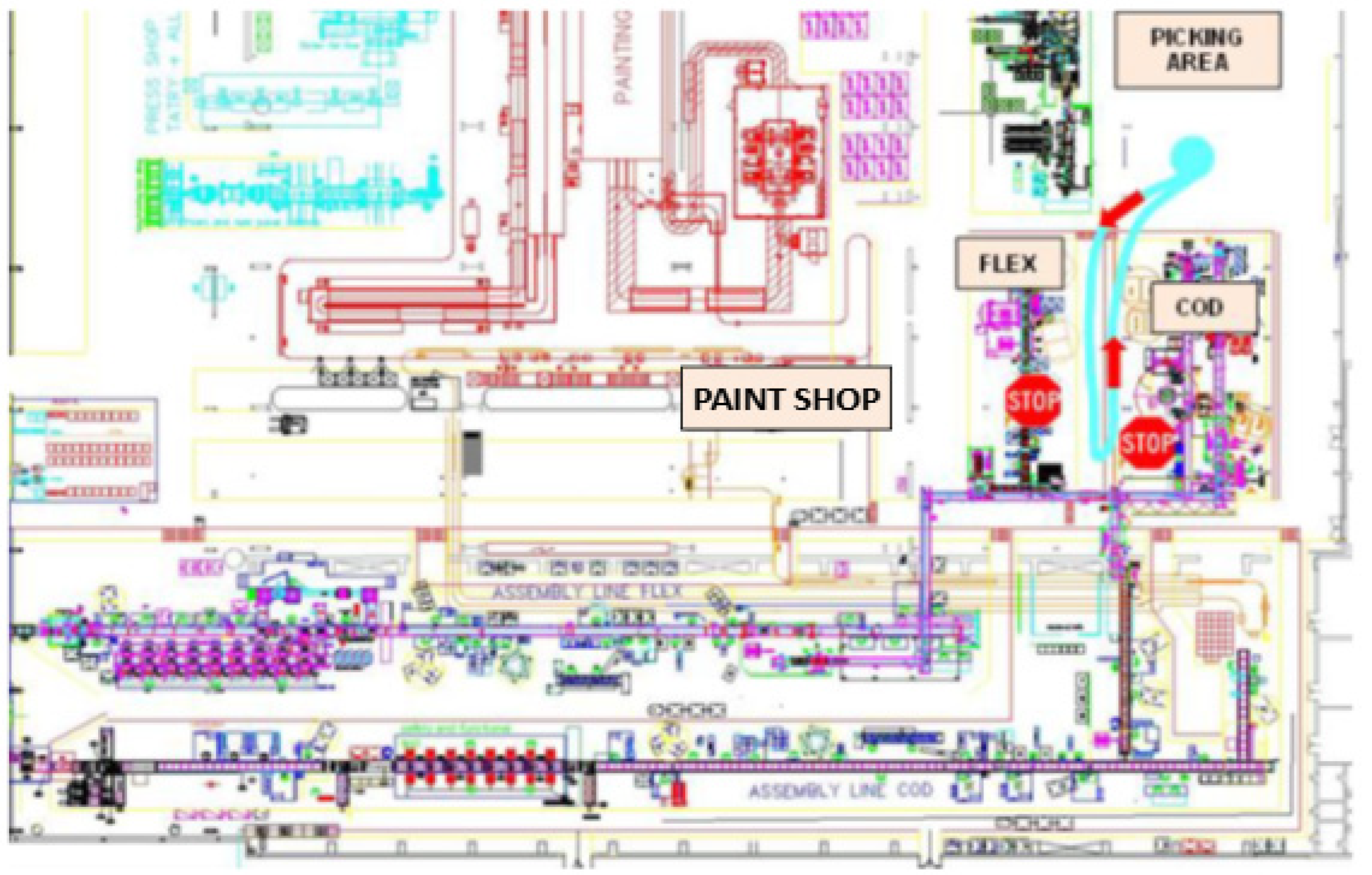 Figure 2 is a company layout where we have shown the route for the Front Wall component from the Paint Shop to the COD and FLEX.