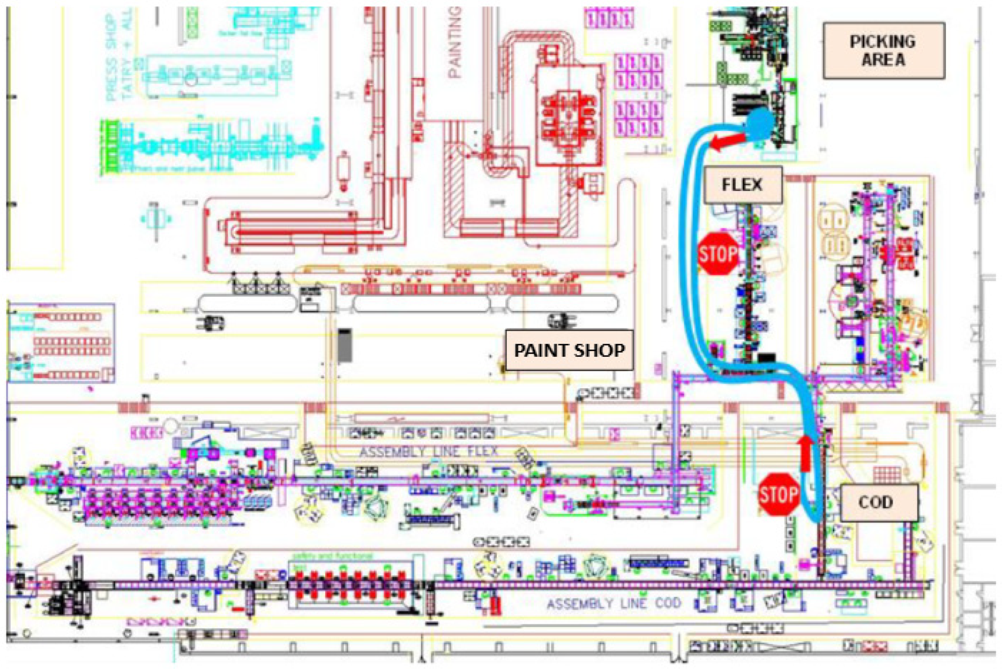 Figure 1 is a company layout where we have shown the route for the Front Weight component from the Picking Area to the COD and FLEX line.
