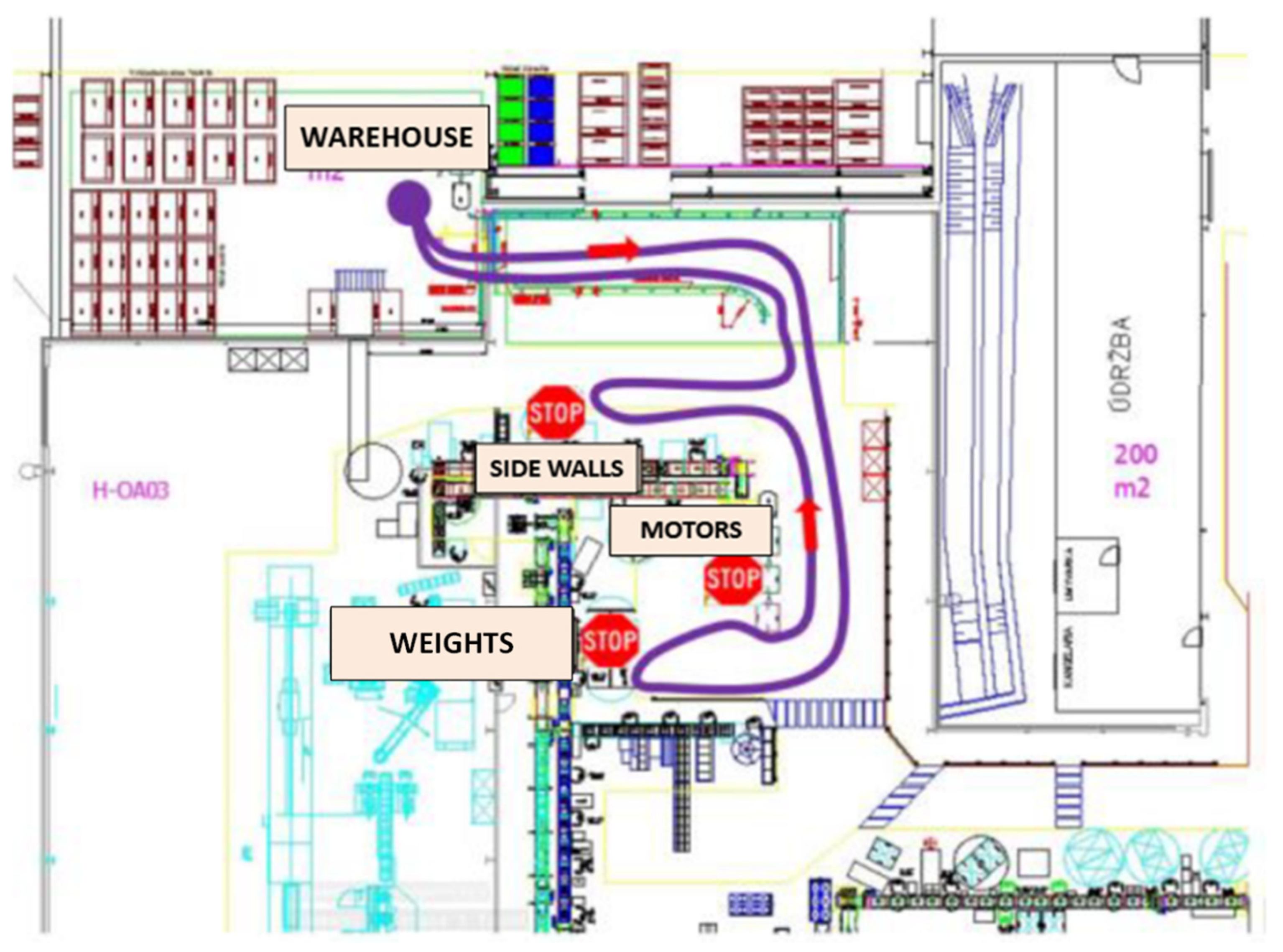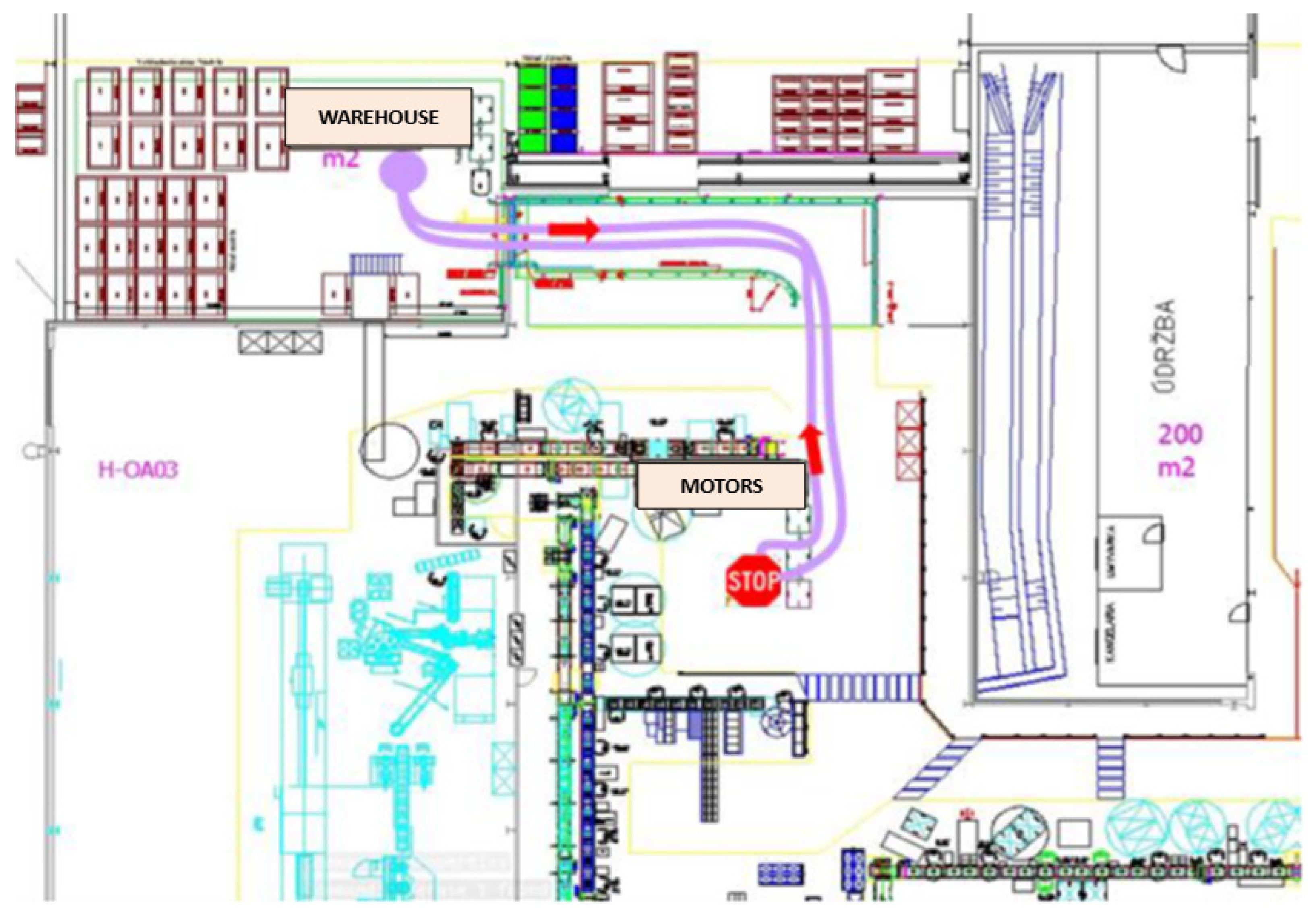 Figure 6 shows the routing of a motor component from the warehouse to the workplace.