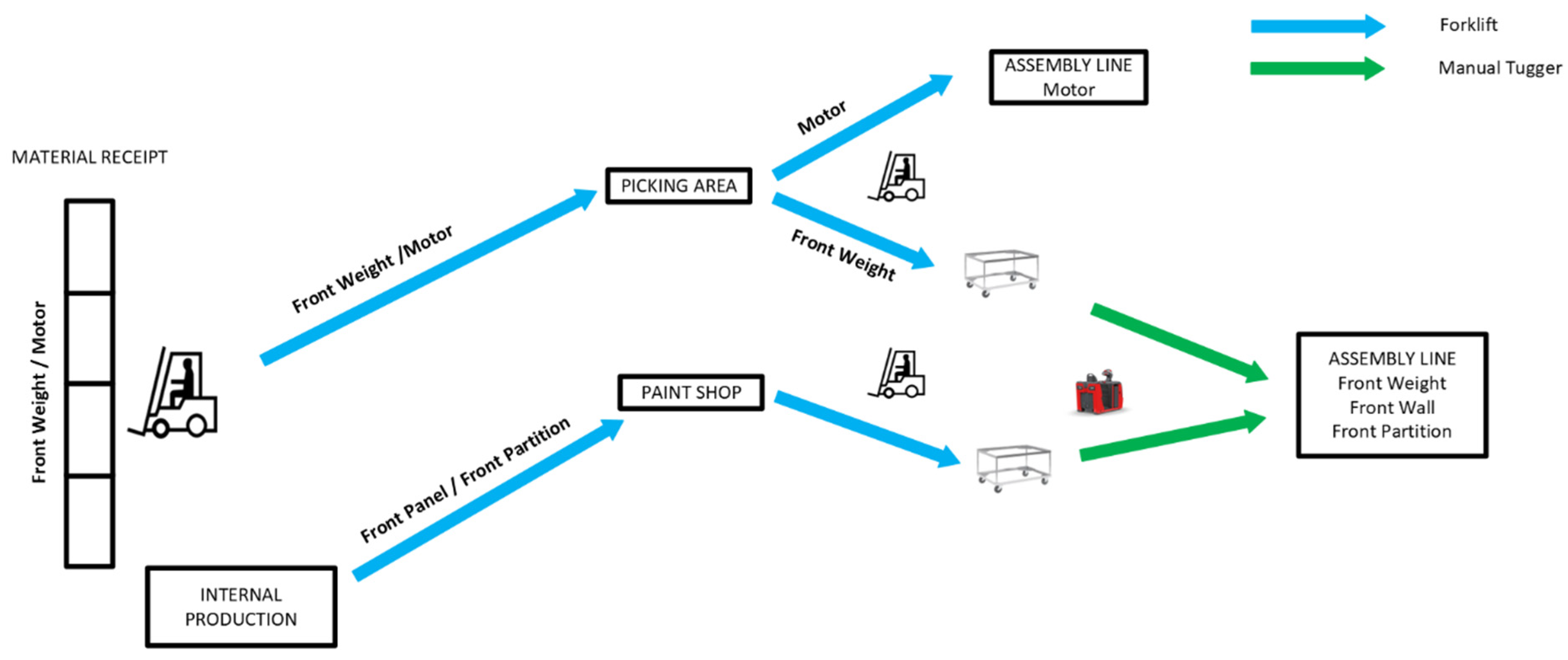 The entire process begins with the transfer of goods to the warehouse from the truck, where a worker uses a forklift to unload the Front Weight and Motor components to a temporary storage location at the material receiving area. The components are then placed into the storage location. Currently, the Front Weight, Front Wall, and Front Partition components are delivered to the assembly line using a hand truck. At the Picking Area (Picking Area/Warehouse), they are placed on a chassis by an AHV worker, which is then transported to the assembly line by a manual operator. One worker per shift handles the component transport process. The Front Wall and Front Partition components are manufactured by the company’s in-house manufacturing process.
