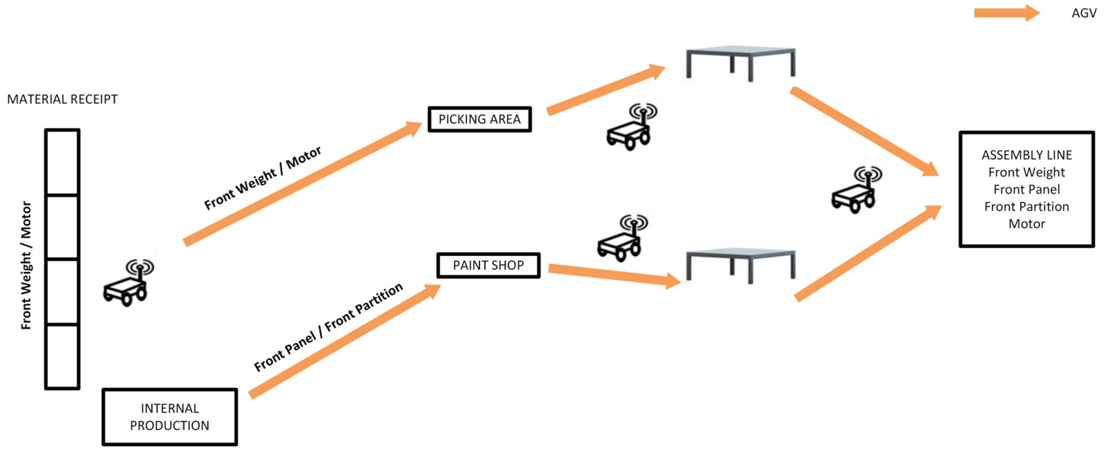 Table 11. An average AGV speed of 0.2 m/s was assumed. The process includes the transport of two chassis to the workplace and the transport of the empty chassis to the Paint Shop.