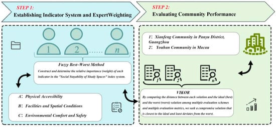 The two sites exhibited variation in shading form, facility conditions, and user density. To provide a solid foundation for the comparative analysis presented above, the research integrated resident questionnaires and field-based spatial measurements at two study locations. The two study locations were measured in terms of both subjective perception and objective environment. The two methods provided an empirical basis for ranking indicator weights and gap ranking using the Fuzzy-BWM and VIKOR models, respectively. This comparative analysis clarifies how the structure of tree-shaded social spaces in communities is different from one another in terms of type and provides a reference for related urban renewal projects and age-friendly environment planning.