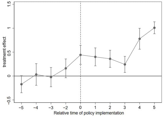 Among these, is a group of dummy variables that equal 1 if a city has adopted the low-carbon pilot policy in year t = k, and 0 otherwise. All other variables align with the definitions in Equation (1). Here, k denotes the number of years relative to the policy implementation. To avoid multicollinearity, the period immediately before the policy (k = −1) is omitted as the benchmark. Accordingly, k takes values from −5 to 5 (i.e., −5, −4, −3, …, 5). Furthermore, following [57], first compute the prior mean, and then take a de-mean approach to the regression coefficients and confidence intervals of all periods to deal with the existing prior trends as much as possible.