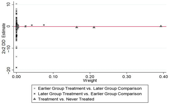 We use Bacon decomposition to check for possible biases in the difference-in-differences design. Table 3 and Figure 4 show the results. The weight proportion of the time-varying treatment group using the untreated group as the control is as high as 78.7%. In contrast, the weight of “newly treated individuals” using “already treated individuals” as the control is only 14.9%. These results mean there is no big bias in the two-way fixed effects estimates. This supports the robustness of our conclusion. This decomposition directly addresses the potential biases arising from treatment timing heterogeneity in staggered DID designs, including the issue of “forbidden comparisons” where earlier-treated pilot cities are used as controls for later-treated ones. In the context of the LCCPs, the relatively low weight (14.9%) assigned to this potentially problematic comparison category indicates that such comparisons do not dominate our overall treatment effect estimate. Furthermore, the specification of our baseline model, along with the phased implementation of the LCCPs, helps to limit the influence of these comparisons, thereby reinforcing the reliability of our primary DID estimates.
