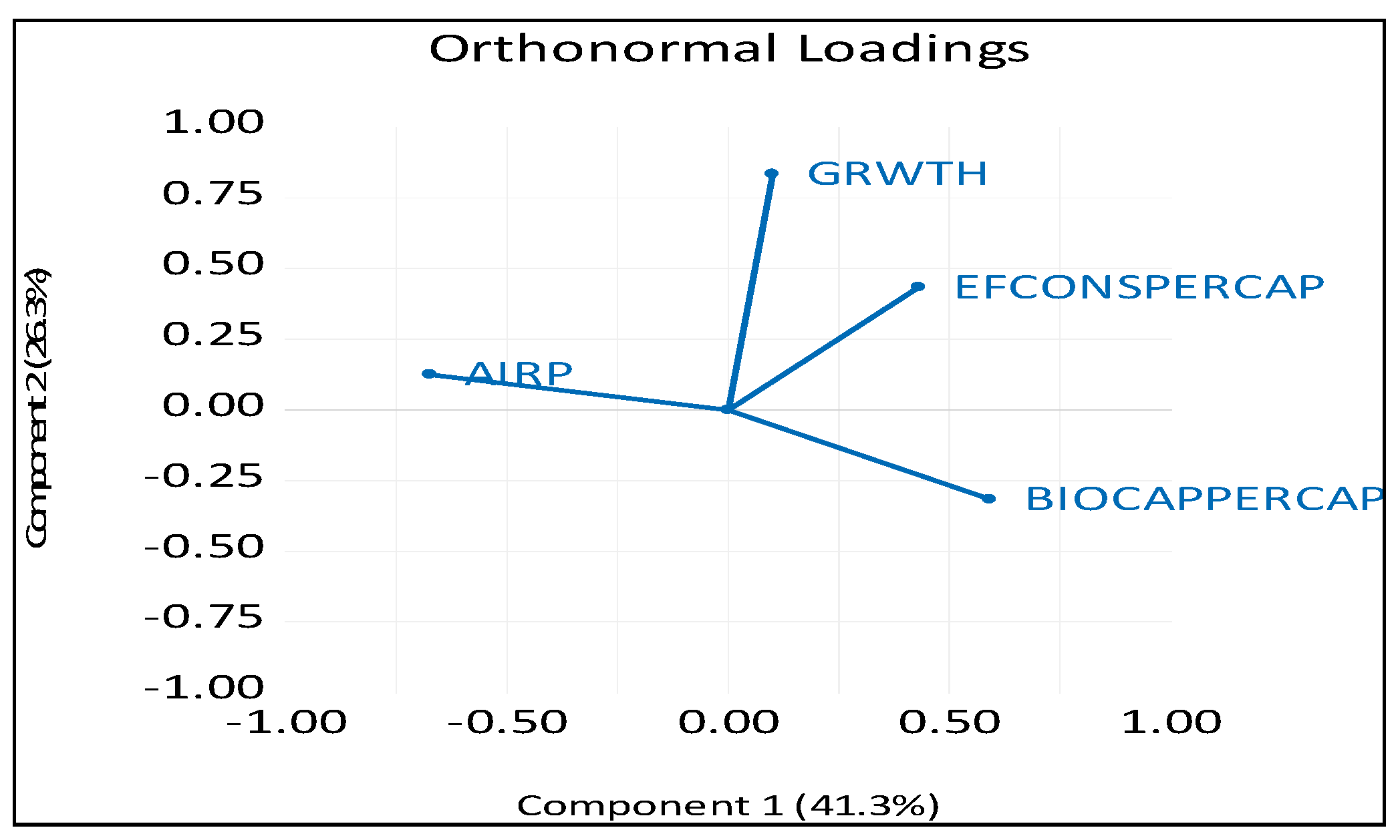 Figure 2, the variables biocapacity, ecological footprint, and gross national product (GNP) exhibit a positive relationship with one another within the index, whereas air pollution shows a negative relationship with these variables. Biocapacity reflects a region’s ability to produce renewable natural resources and is one of the key components used in the calculation of the ecological footprint. Therefore, a positive correlation between these two variables is an expected outcome. Likewise, the negative association between air pollution and these variables is also consistent with theoretical expectations. To enhance the interpretability and clarity of the principal components (PCs), a rotation procedure was applied. Rotation increases the factor loadings of variables without altering their underlying mathematical properties. In this study, the Varimax method, which is one of the most commonly used orthogonal rotation techniques, was employed. The results of the rotation are presented in
