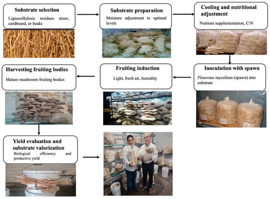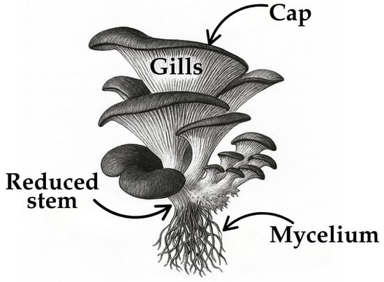 - Mastranzo-Pérez, L.A.; Hernández-Domínguez, E.M.; Falcón-León, M.P.; Álvarez-Cervantes, J. Pleurotus Spp: A Cosmopolitan Fungi of Biotechnological Importance. Sci. Agropecu. 2025, 16, 79–91. [Google Scholar] [CrossRef]