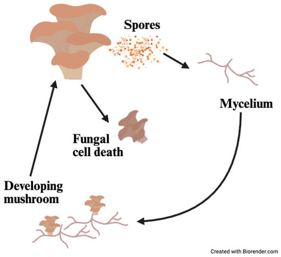 Reproductive cycle of P. ostreatus (Oyster mushroom). The diagram illustrates the life stages of the fungus, beginning with spore release, followed by mycelium development from germinated spores. The mycelium grows through the substrate, leading to the formation of a developing mushroom. After maturation, the mushroom undergoes fungal cell death, completing the cycle and initiating new spore release.