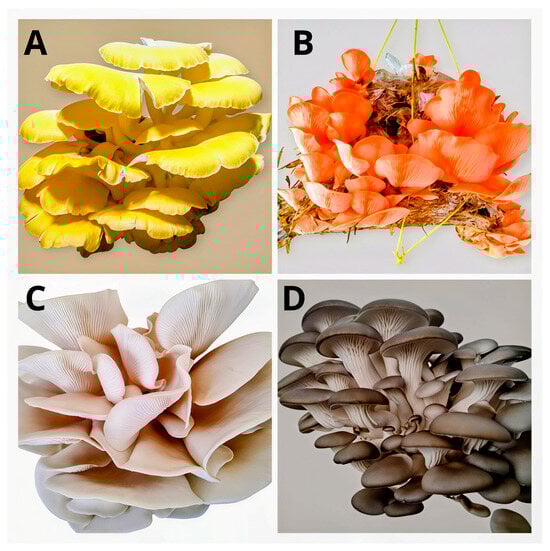 Morphological diversity of Pleurotus species cultivated on different substrates: (A) P. citrinopileatus (yellow oyster), (B) P. djamor (pink oyster), (C) P. ostreatus (white oyster), and (D) P. ostreatus (gray oyster). All photographs are original and were taken by the authors.