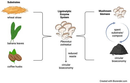 Mushrooms are macrofungi with complex physiological systems that rely on the secretion of extracellular enzymes to access nutrients from lignocellulosic materials. These enzymes decompose complex polymers such as lignin, cellulose, and hemicellulose into simpler, assimilable molecules [31]. Among edible fungi, Pleurotus species exhibit some of the most efficient lignocellulolytic systems, making them valuable in both ecological and industrial contexts. P. ostreatus, the most widely studied species, produces a versatile enzymatic arsenal that includes laccases, manganese peroxidases (MnPs), lignin peroxidases (LiPs), cellulases, and xylanases [32]. These enzymes act synergistically to degrade plant biomass, enabling the fungus to colonize a broad range of agricultural residues such as wheat straw, sugarcane bagasse, corn stalks, and sawdust. Laccases and MnPs, in particular, play a key role in lignin degradation, a process critical for accessing cellulose and hemicellulose embedded in plant cell walls.