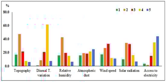 The present study employs overlay analysis in a GIS environment. This technique entails systematic procedures that integrate different layers of spatial datasets to achieve a defined objective while considering a wide range of criteria [3,29]. To ensure consistency across all datasets, it is important to have all the data with the same geographical reference system, namely the Geographic Coordinate System (GCS), based on the WGS-1984 datum. ArcMap Software (Version 10.3) was used for displaying, processing, and producing thematic maps. Seven spatial variables (GDEM, LST, %RH, wind speed, atmospheric dust, solar radiation, and access to electricity) were incorporated into this analysis. Table 2 illustrates the categories used for each of these layers.