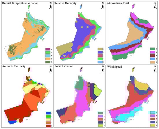 Renewable energy resources, particularly wind and solar radiation, are considerably abundant in Oman. High wind speed (Class 1) is observed to predominate along the southeastern coast, covering 17% of the country, while the highest regions of solar radiation (Class 1) occur in the northern part, representing 10% of the country. These two factors highlight the country’s high potential for renewable energy resources and explain why regions exhibiting multiple favorable environmental and physical factors tend to produce higher MCDA suitability classes.