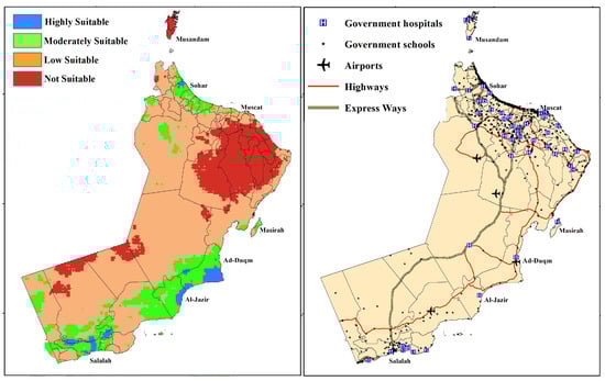 The overall suitability index (OSI) map (left) shows the locations of the four suitability classes in Oman. The right map shows the locations of major services, such as airports, highways, schools, and hospitals in the country.