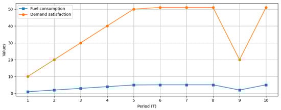 Figure 2 shows the relationship between fuel consumption and the satisfaction of transport demand. Initially, fuel consumption follows the increasing trend of demand. Following the introduction of new, more efficient technology, the same level of demand is met with lower fuel consumption, indicating an improvement in the fleet’s overall efficiency. This effect becomes evident from period 3 onward, when the share of new-technology vehicles in the fleet begins to dominate.