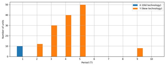 The initial fleet consists of 10 legacy vehicles (), representing older technology with relatively high unit emissions () and higher variable () and fixed () operating costs. These vehicles can be progressively replaced with low-emission alternatives. In the numerical example, the parameter is assumed to vary across periods to reflect changes in the upstream electricity mix’s emission intensity. In the illustrative example, the emission factor of the new technology varies between 0.195 and 0.95 across the planning horizon. These values reflect time-dependent characteristics of the upstream energy mix rather than differences between multiple technologies. Even in periods with higher emission factors (e.g., 0.95), the new technology remains a lower-emission option relative to the legacy fleet (0.995), thereby preserving its role as the environmentally superior choice in the model. The unit purchase cost of new-technology vehicles is . Both old and new-technology cars can be sold, with unit resale prices of and , respectively, (constant across periods).