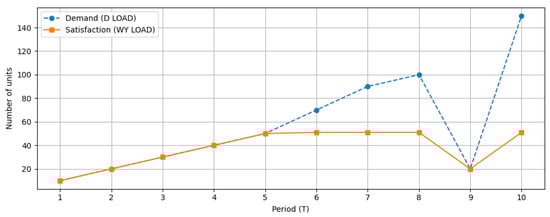 Finally, Figure 5 compares the demand for transport services with the actual level of service delivered by the fleet. In the early periods, demand is fully satisfied using internal resources. Beginning from period 6, part of the demand must be outsourced to external service providers. This is caused by the simultaneous effects of emission limits, budget constraints, and an insufficient fleet size relative to rapidly growing demand. The model uses outsourcing only when indispensable, as the cost of external services is significantly higher than the cost of internal production.