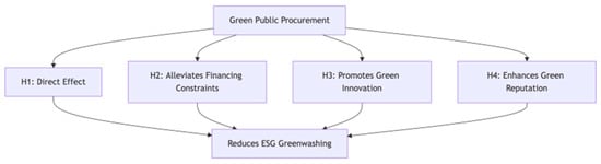 From this theoretical perspective, through the market-pulling effect on the demand side, GPP not only stimulates environmental innovation [14], but also effectively guides industries toward green and low-carbon transformation. Studies show that GPP can generate stable market demand for green products [22], which in turn motivates enterprises to engage in production activities [23]. Additionally, because of their strong financial capacity and stable procurement scale, government customers enable GPP to significantly improve firms’ cash flow expectations and provide the market with a clear signal of green development [20,22,23,24]. Since GPP standards are set by the government, independent of commercial interests and subject to strict third-party certification, this enhances the verifiability of corporate environmental signals, thereby encouraging firms to make substantive investments in environmental protection to enhance their authentic ESG performance. Therefore, the filtering function of GPP becomes a continuous driver of corporate green transformation, significantly reducing the likelihood of manipulating ESG data, thereby suppressing corporate ESG greenwashing. Based on the above analysis, we put forward the following hypothesis: