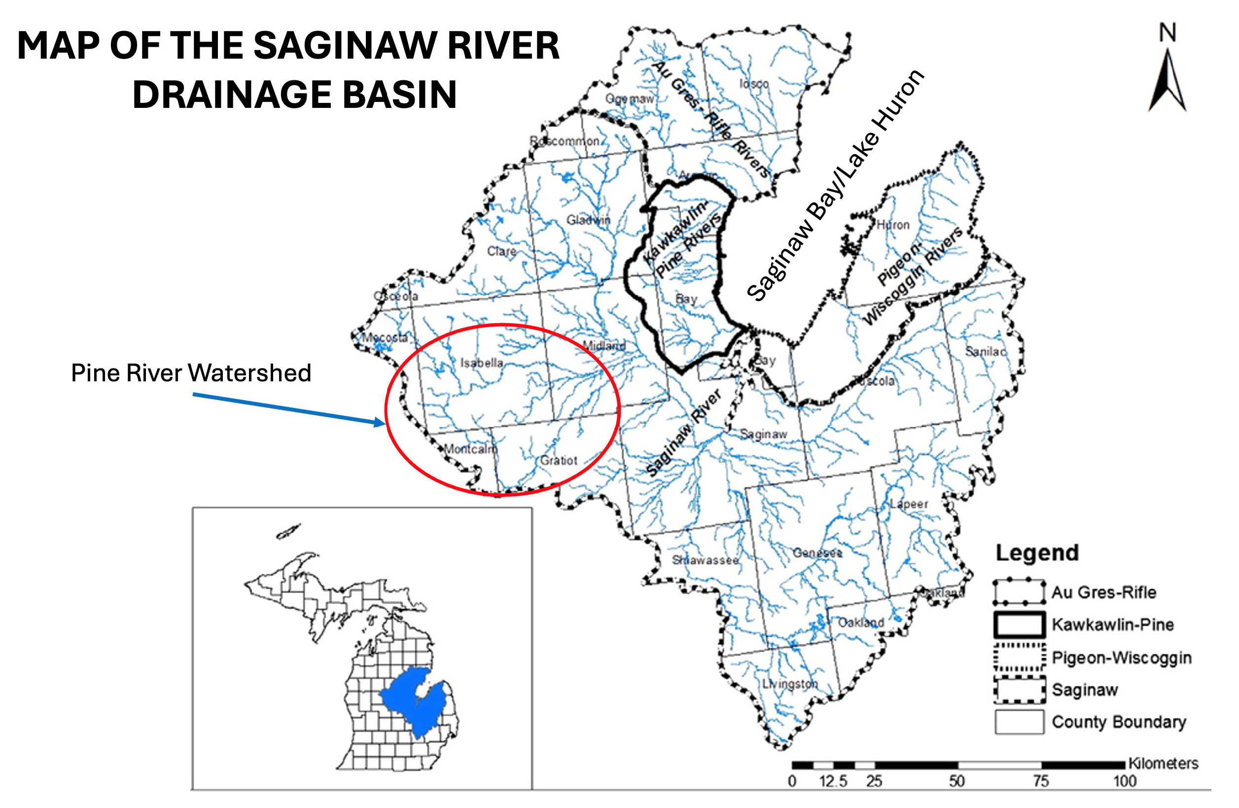 Figure 1. Map showing the Pine River Watershed and its place within the larger Saginaw River Drainage Basin in central Lower Michigan. The Pine River Watershed is part of the Lake Huron/Saginaw Bay Drainage Basin [19].