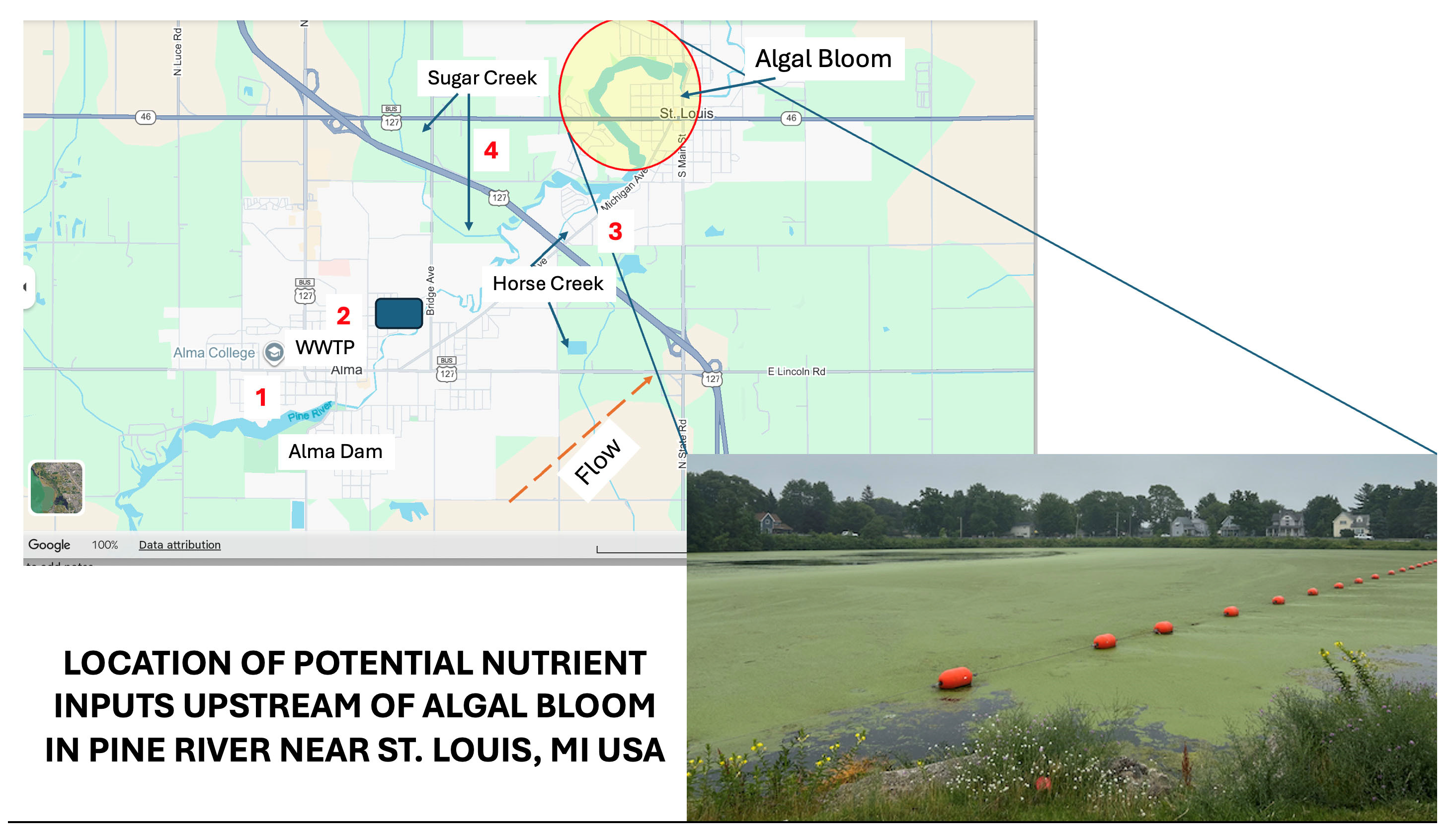 By 2017 and 2018, residents downstream of the Alma Dam near St. Louis, Michigan noticed a new pervasive growth of algae and aquatic vegetation in the Pine River. By 2019, there was a formal complaint lodged at a City of St. Louis Commission meeting as reported in the Gratiot County Herald. Alma College, the Great Lakes Watershed Institute, and the State of Michigan were contacted by the cities of St. Louis and Alma, Michigan, to help ascertain why algal blooms were suddenly appearing downstream of the Alma Dam. Because the upper watershed was already heavily impacted by agricultural inputs, it was assumed that nutrients from upstream sources flowing over the Alma Dam were the main sources of the algal blooms. Other potential nutrient sources were identified and presented in a report to the Office of Water Enforcement and Compliance, USEPA Region V [2].