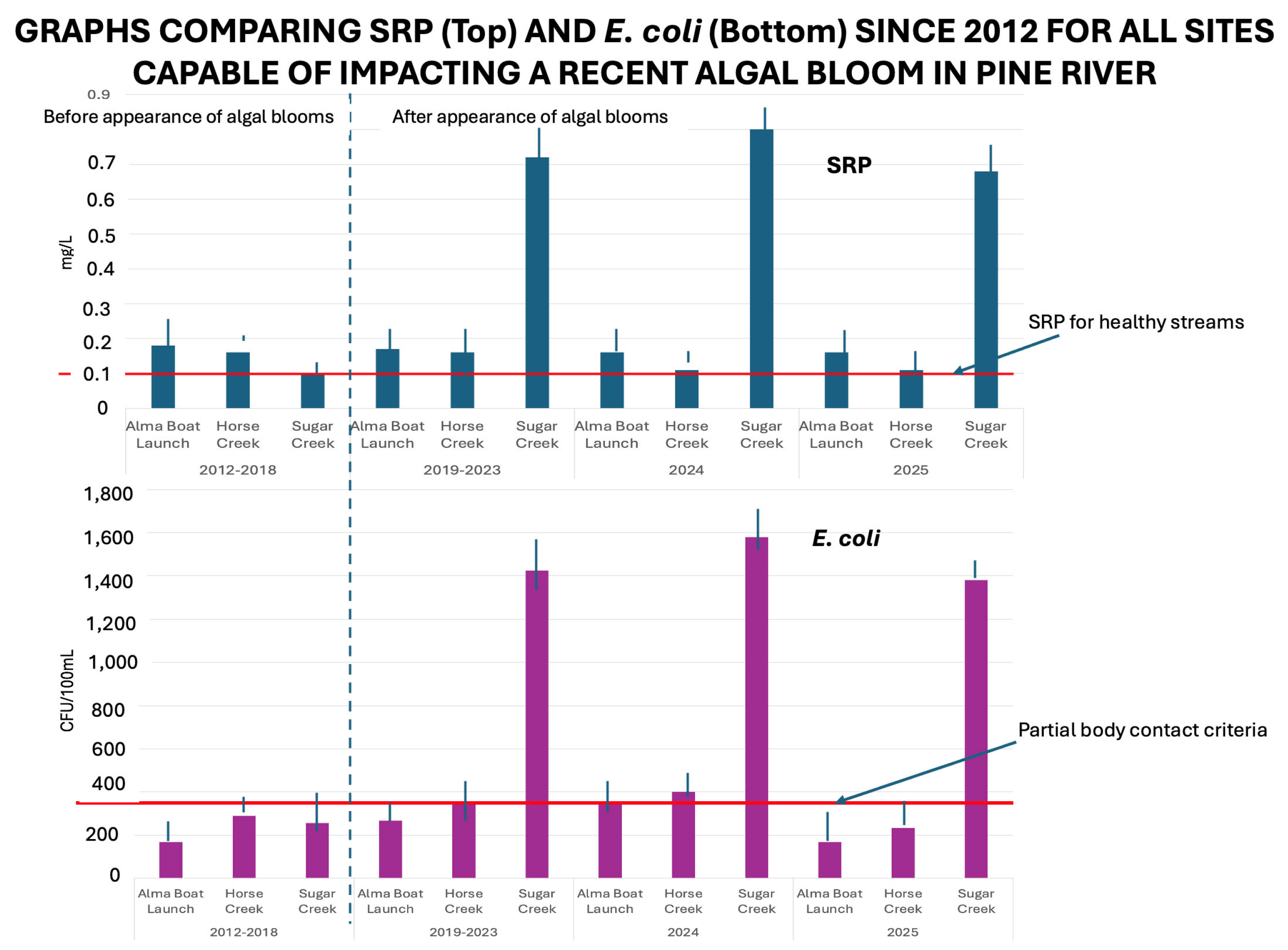 Figure 4. Graphs showing average concentrations of SRP and E. coli for varying timeframes. For each site (x-axis), potential nutrient sources of the algal bloom in the Pine River near St. Louis, Michigan are listed. Note: Sugar Creek dominates in both nutrient and E. coli inputs after 2018 compared with other sites.