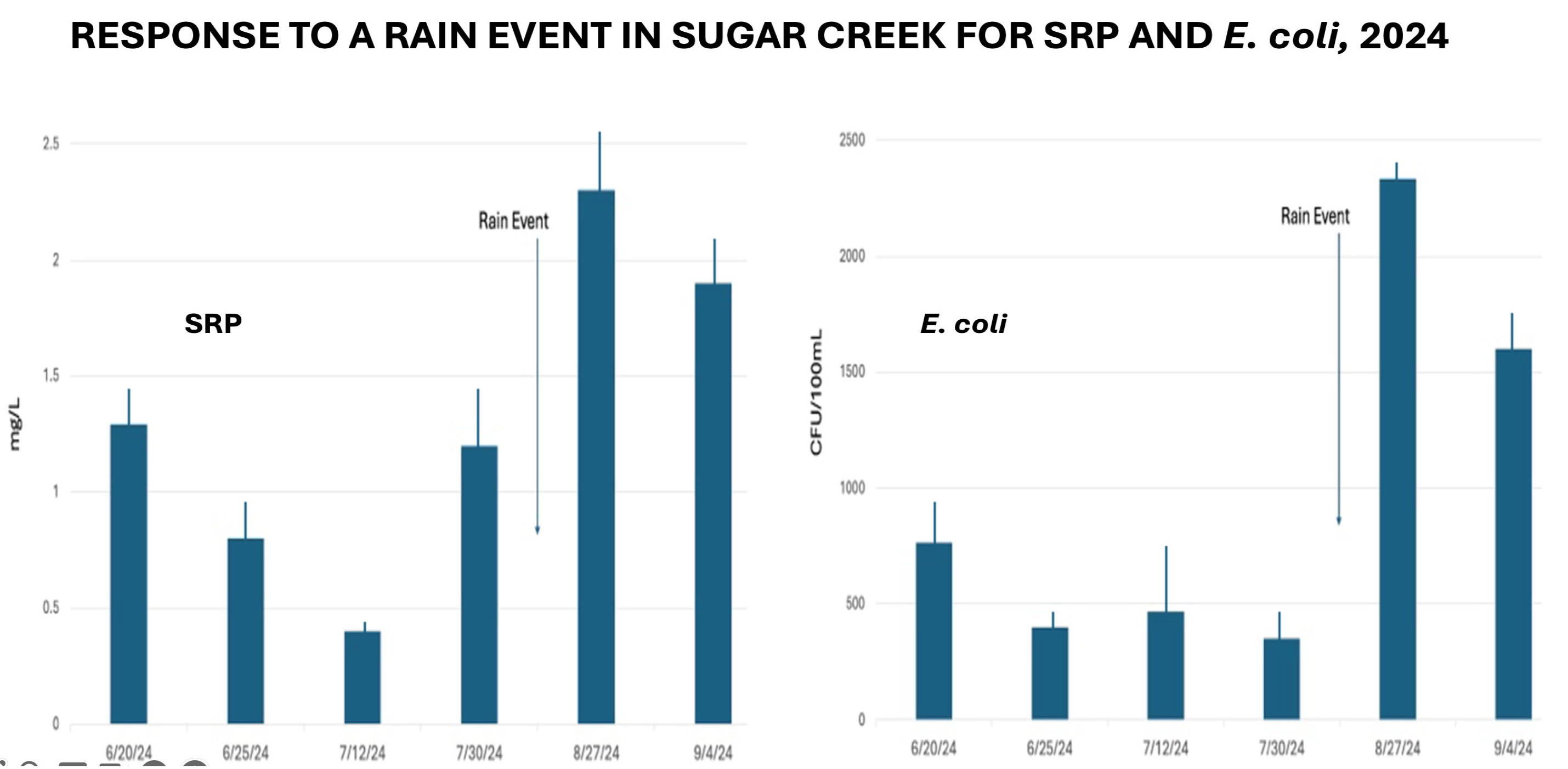 Figure 7. Graphs from 2024 showing spikes in SRP and E. coli after a rain event from the same sampling sites as Figure 6. This indicates the input source is coming from underdrains (SRP p ≤ 0.01/E. coli p ≤ 0.006).