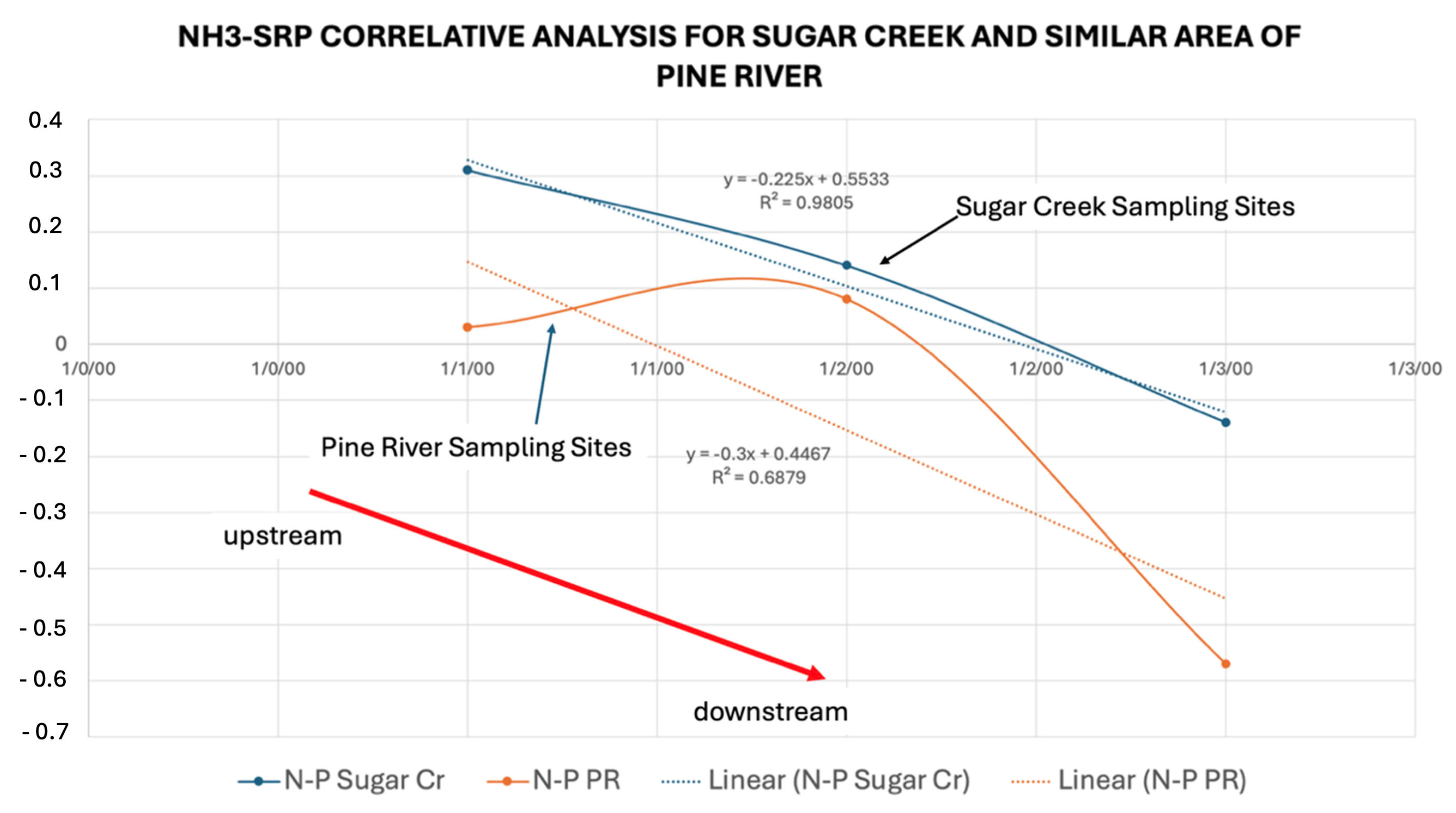 Results of a correlative analysis between NH3-N and SRP show a stronger correlation (r = 0.38) at the start of the creek, decreasing in a clear linear fashion (r2 = 0.98) downstream (Figure 8). A second site along the Pine River was chosen as a comparison, but the correlation fluctuated, and there was a weak, linear relationship downstream (r2 = 0.69) as inputs occurred between sampling sites.