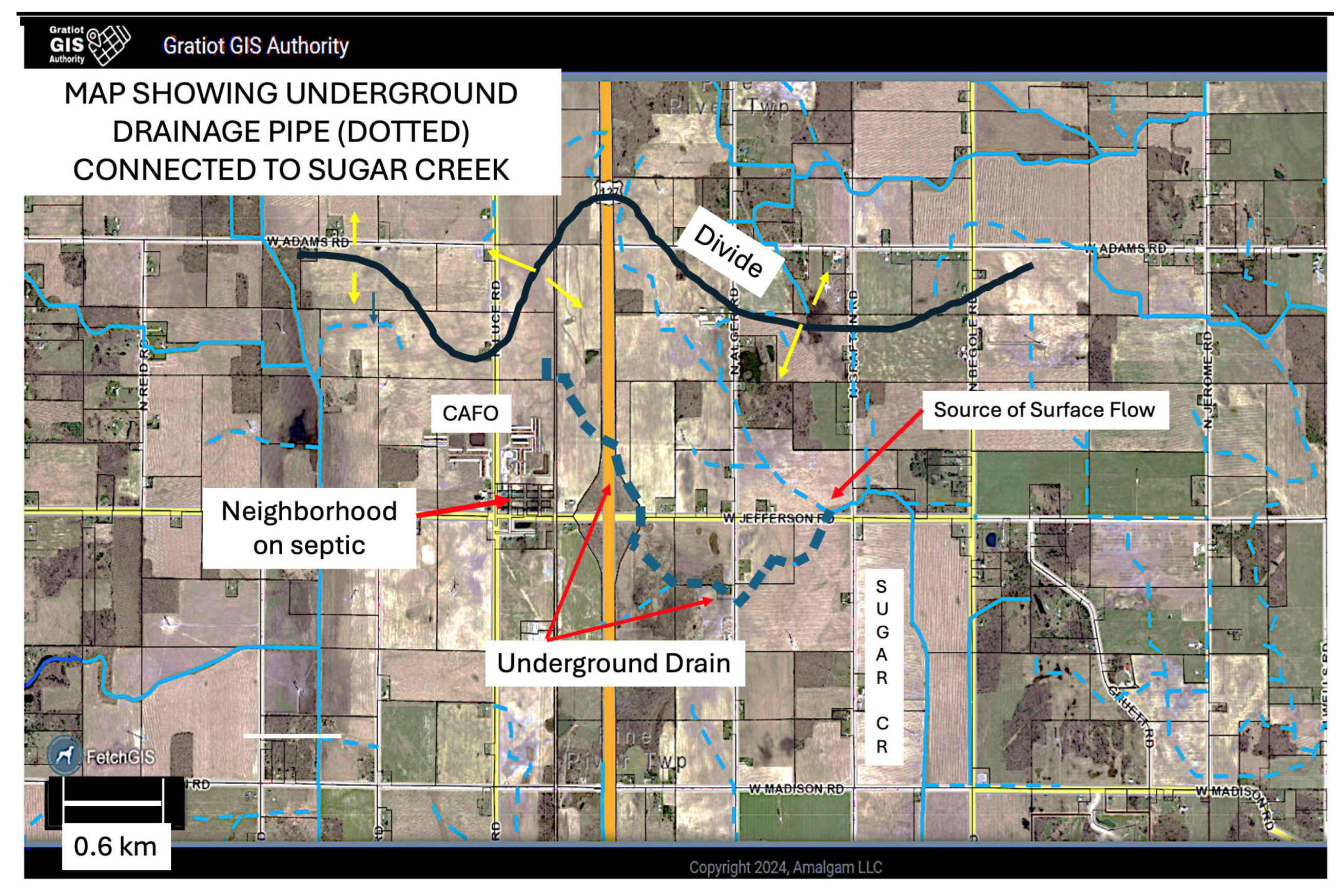 Figure 9. County drain map showing the existence of an underground drain sourced from a nearby livestock facility to the head of Sugar Creek.