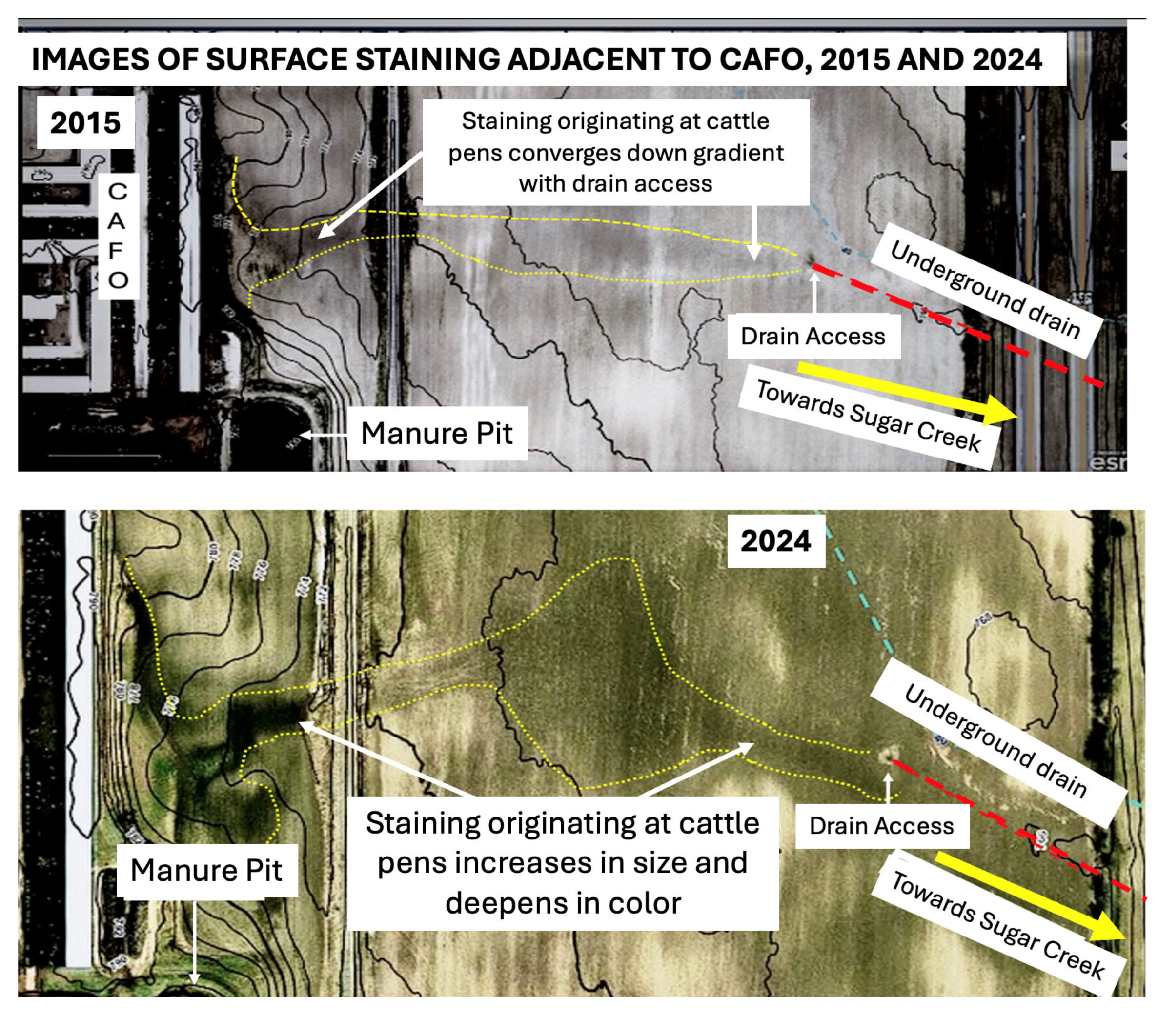 Figure 10. Satellite images (enhanced) showing increased staining on the ground surface leading from a livestock facility to a drain basin that connects with the head of Sugar Creek.