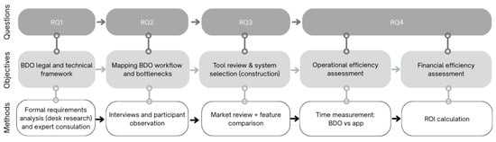 The structure of the article is as follows: Section 2 presents the research methodology; Section 3 provides the contextual background for the study, including the legal and organisational framework; Section 4.1 maps the administrative procedures related to waste transfer; Section 4.2 identifies and categorises the main process bottlenecks; Section 4.3 reviews and evaluates the available IT solutions supporting BDO operations; Section 4.4 presents the results of a case study demonstrating the effects of system implementation; and Section 5 summarises the findings and outlines directions for further development and integration of digital tools within the construction waste management chain.