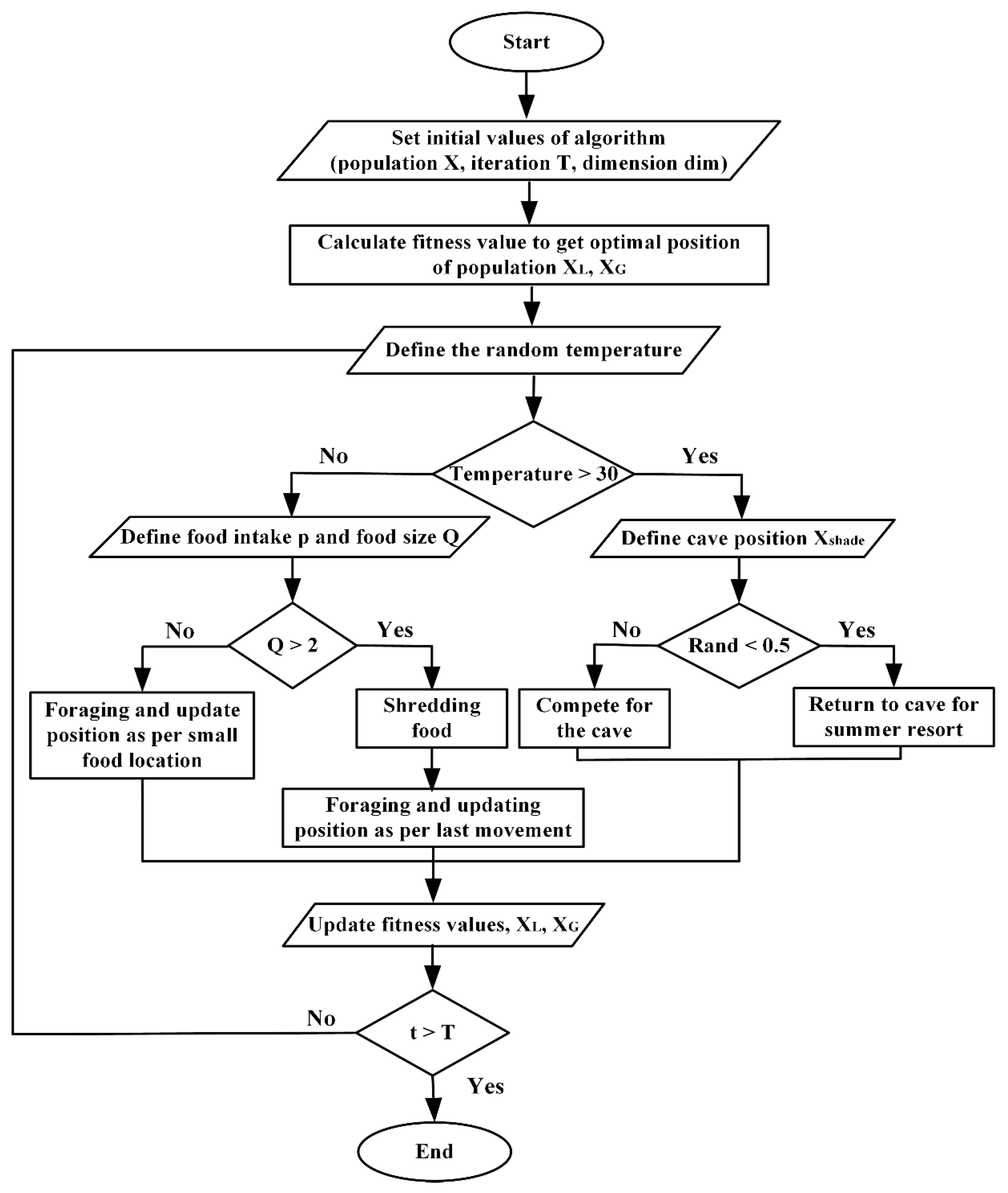 In this context, N denotes the population size, specifying the number of candidate solutions considered during optimization. When the temperature drops below 30 °C, the environment becomes favorable for crayfish feeding, initiating the foraging stage of the Crayfish Optimization Algorithm (COA). During this stage, each crayfish moves systematically toward the food source, guided by optimization rules that mimic natural foraging behavior. Once the crayfish reaches the food source, food size is evaluated to determine the next action. This evaluation is mathematically expressed in Equation (6), where food size acts as a decisive parameter influencing whether crayfish directly consume the food or shred it into smaller pieces, simulating the balance between exploration and exploitation within the optimization framework.