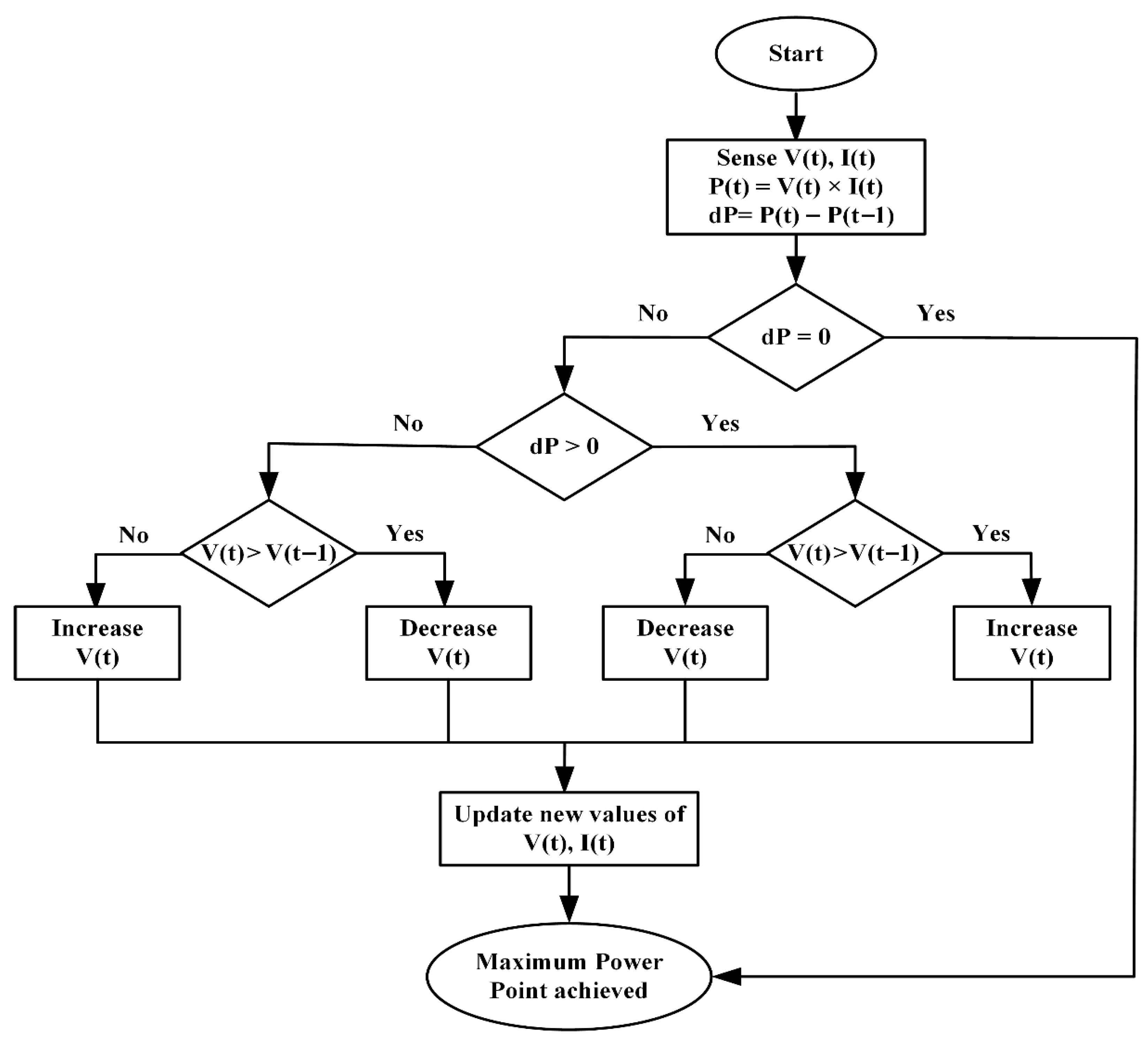 The perturb and observe (P&O) method is an effective Maximum Power Point Tracking (MPPT) technique, particularly under uniform irradiance conditions. It is one of the most widely studied MPPT methods due to its simple structure, ease of implementation, and low cost, making it highly suitable for a wide range of photovoltaic applications and practical energy harvesting scenarios, including small- and large-scale PV systems, residential and commercial installations, and microgrid integration. In this method, the power output of the PV array is calculated from the measured voltage and current values. The instantaneous power and voltage are compared with their previous values to determine the necessary perturbation. By incrementally adjusting the reference voltage and observing the resulting change in output power, the P&O algorithm identifies the appropriate direction to track the maximum power point. Changes in the reference voltage directly influence the PV system’s output power, and the perturbation direction is selected based on the observed power variation. The operational principle of the P&O MPPT algorithm is clearly illustrated in the flowchart shown in
