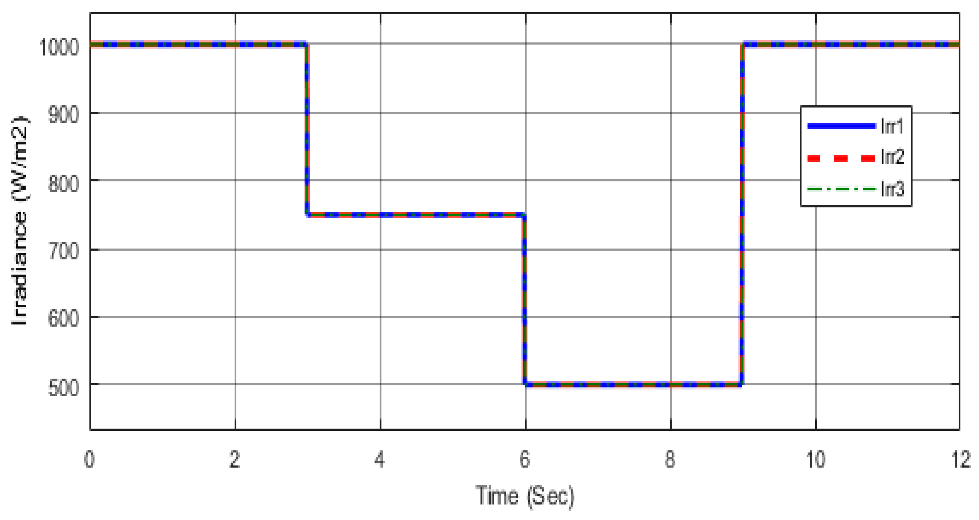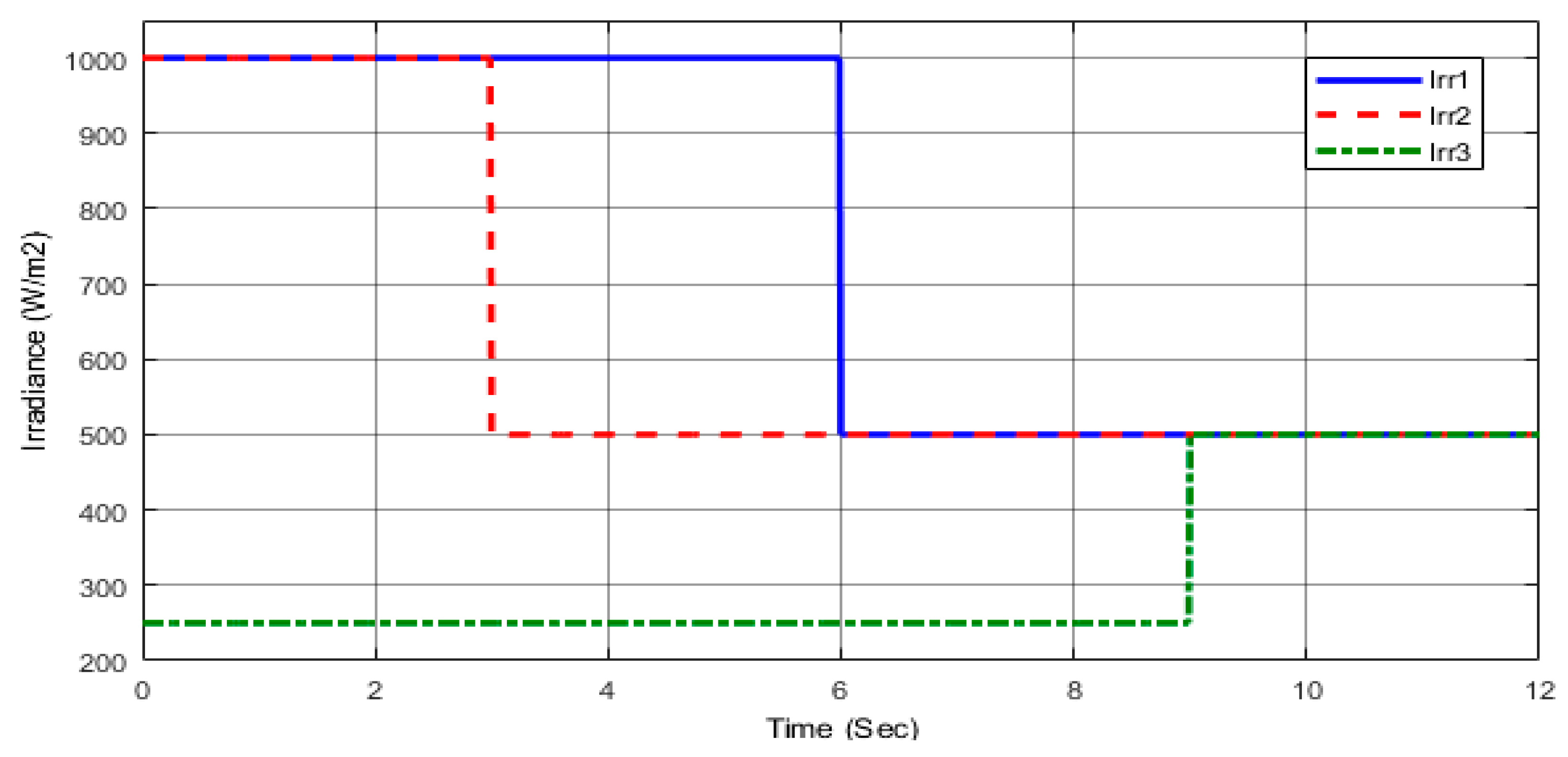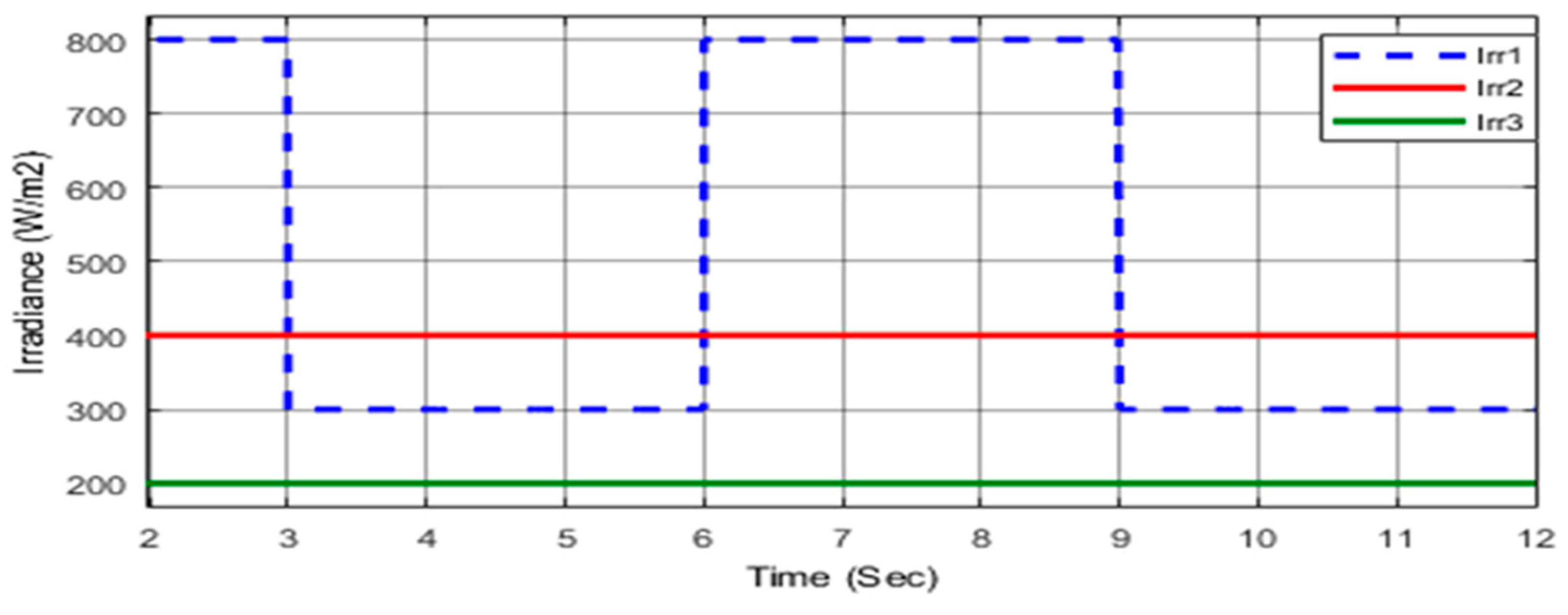 Figure 8. In this configuration, the incident irradiance on the upper, middle, and lower PV groups is denoted as Irr1, Irr2, and Irr3, respectively, as illustrated in the system model with details shown in
