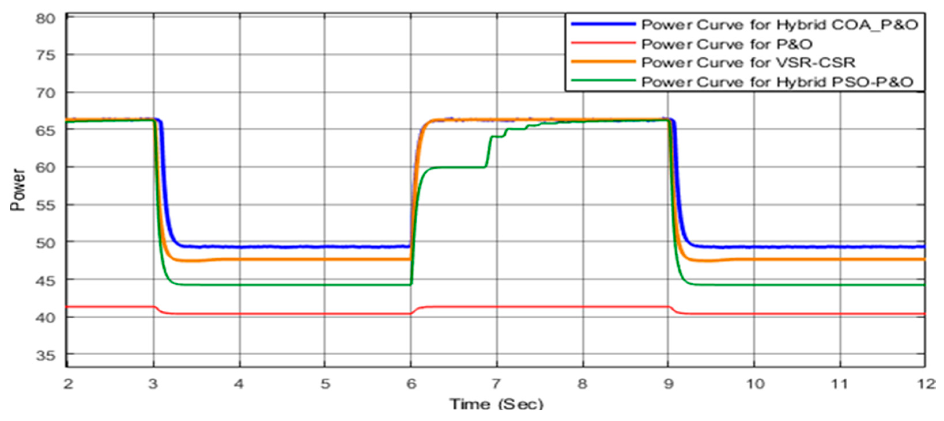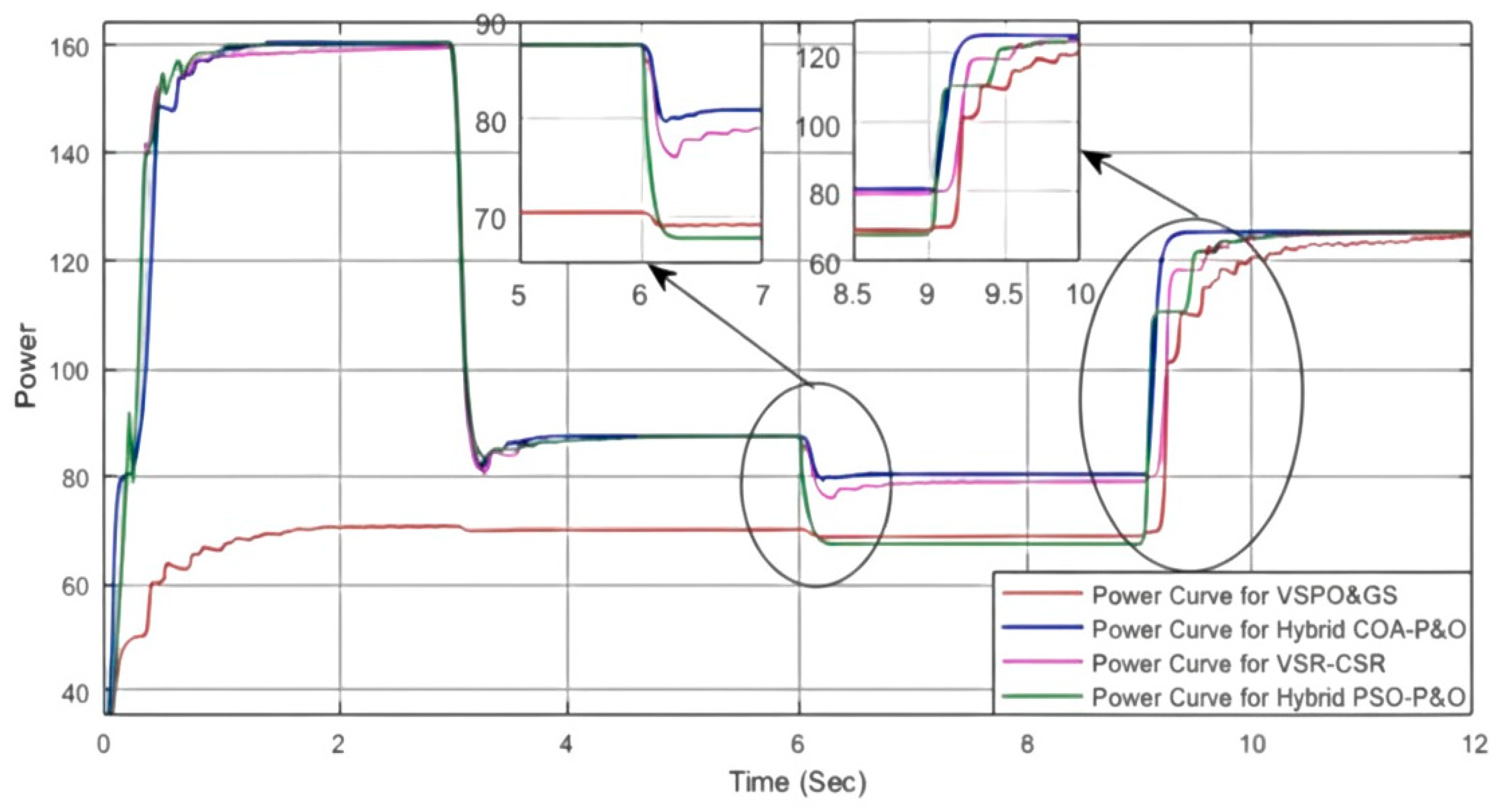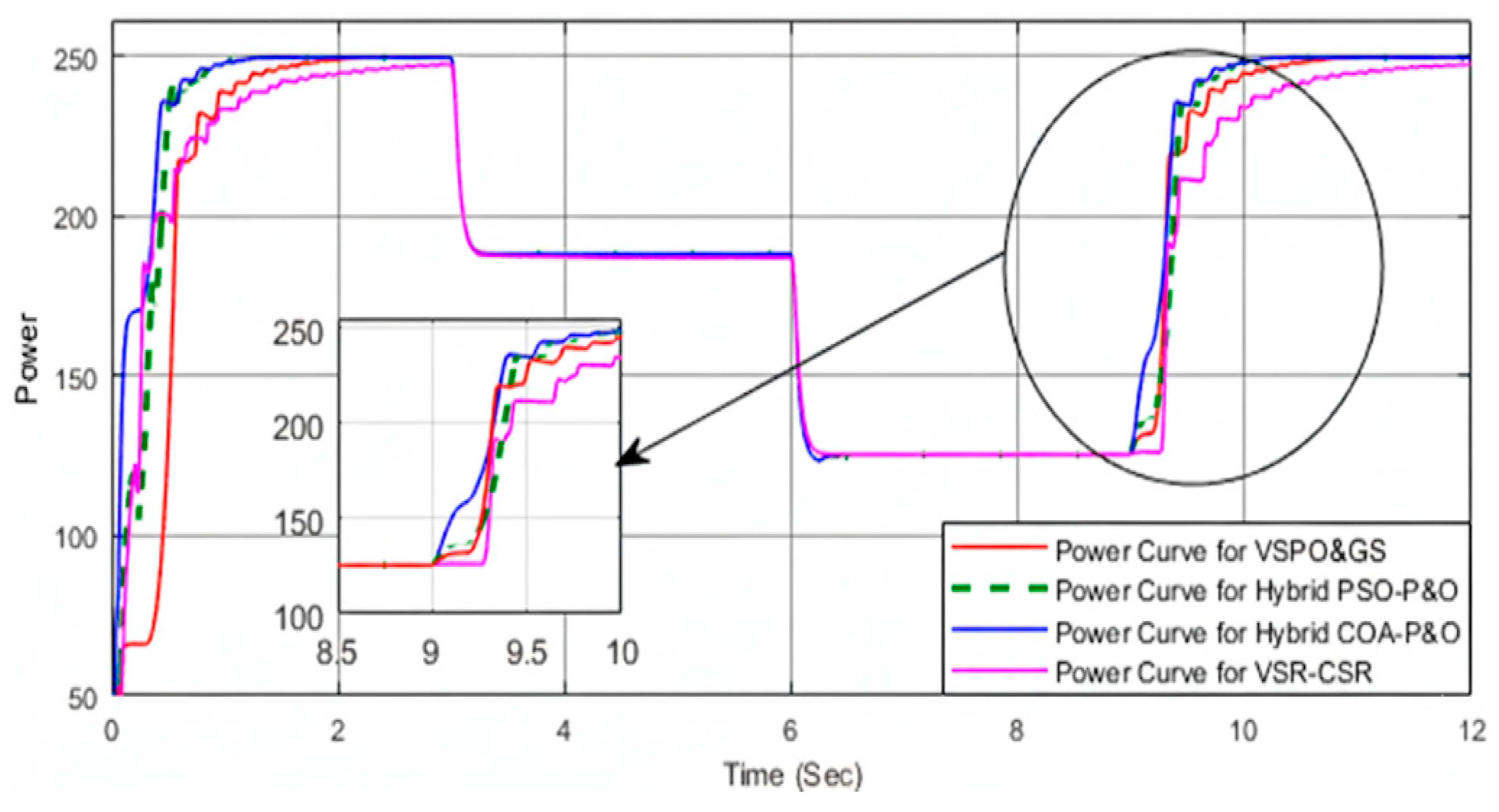 Figure 10. All four MPPT strategies, VSR-CSR, Improved Variable Step P&O with Global Scanning (VSPO&GS), hybrid PSO-P&O, and the proposed COA-P&O, successfully track the MPP, as shown in