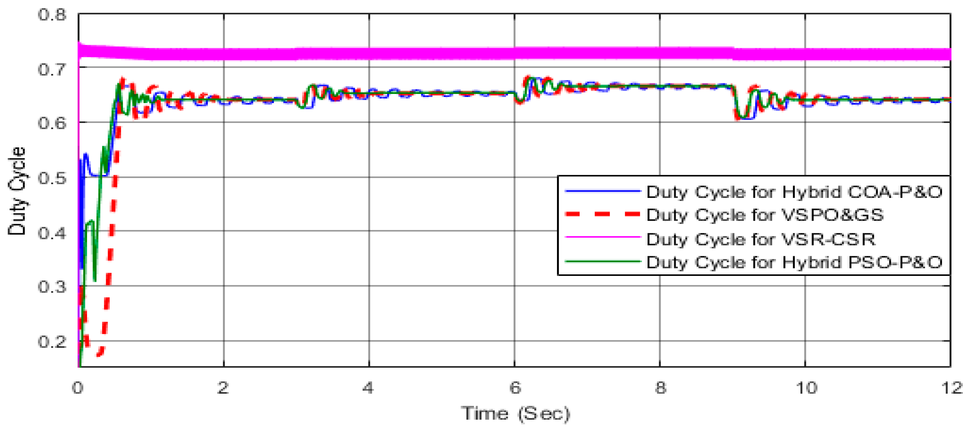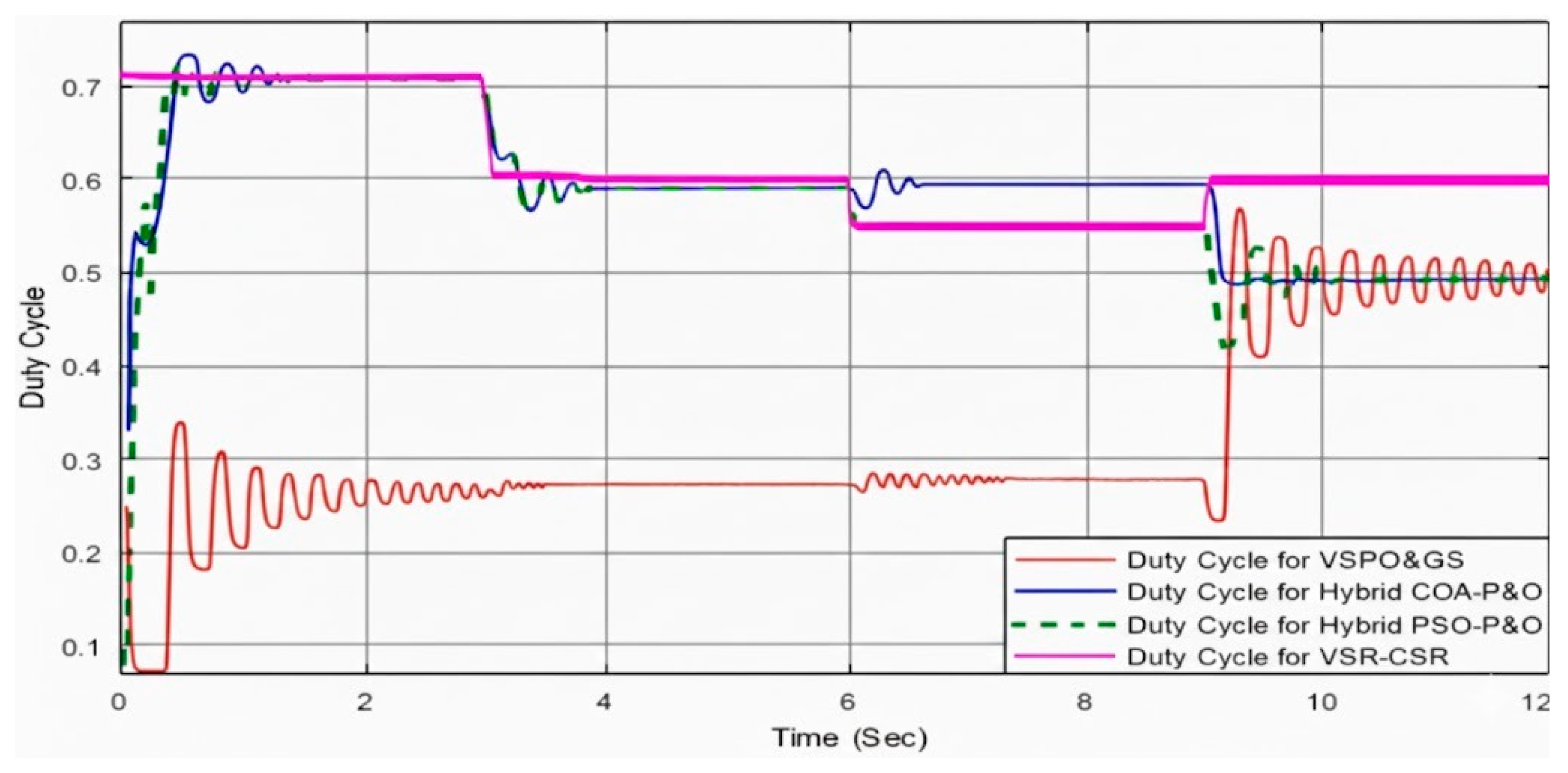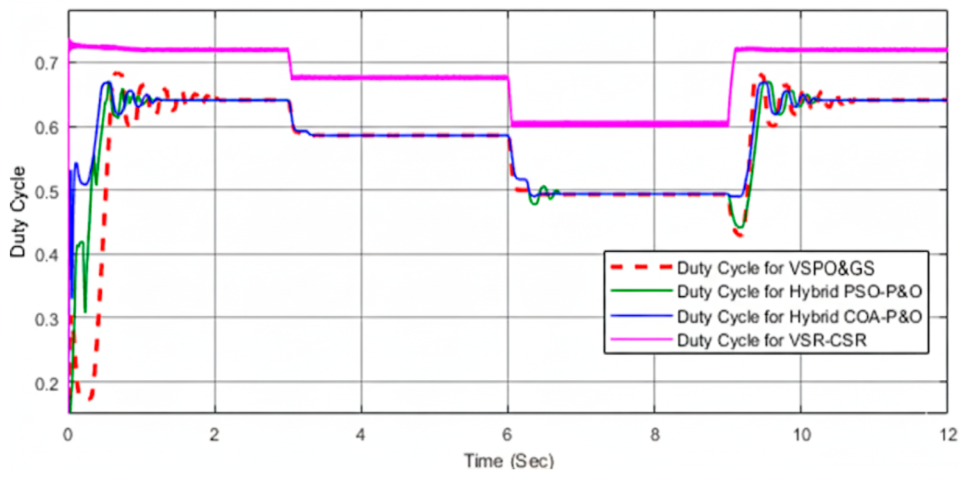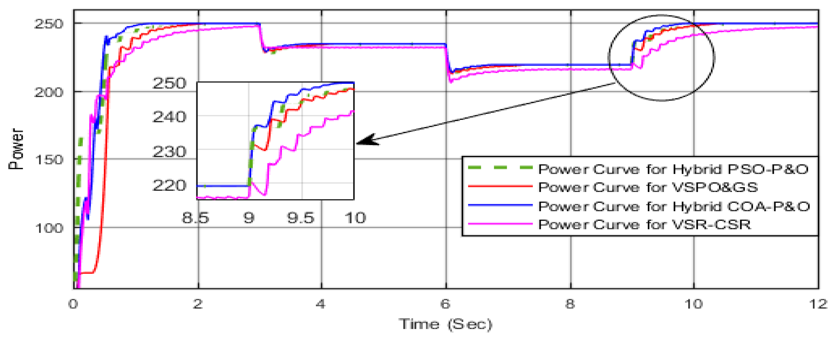 Figure 10. All four MPPT strategies, VSR-CSR, Improved Variable Step P&O with Global Scanning (VSPO&GS), hybrid PSO-P&O, and the proposed COA-P&O, successfully track the MPP, as shown in