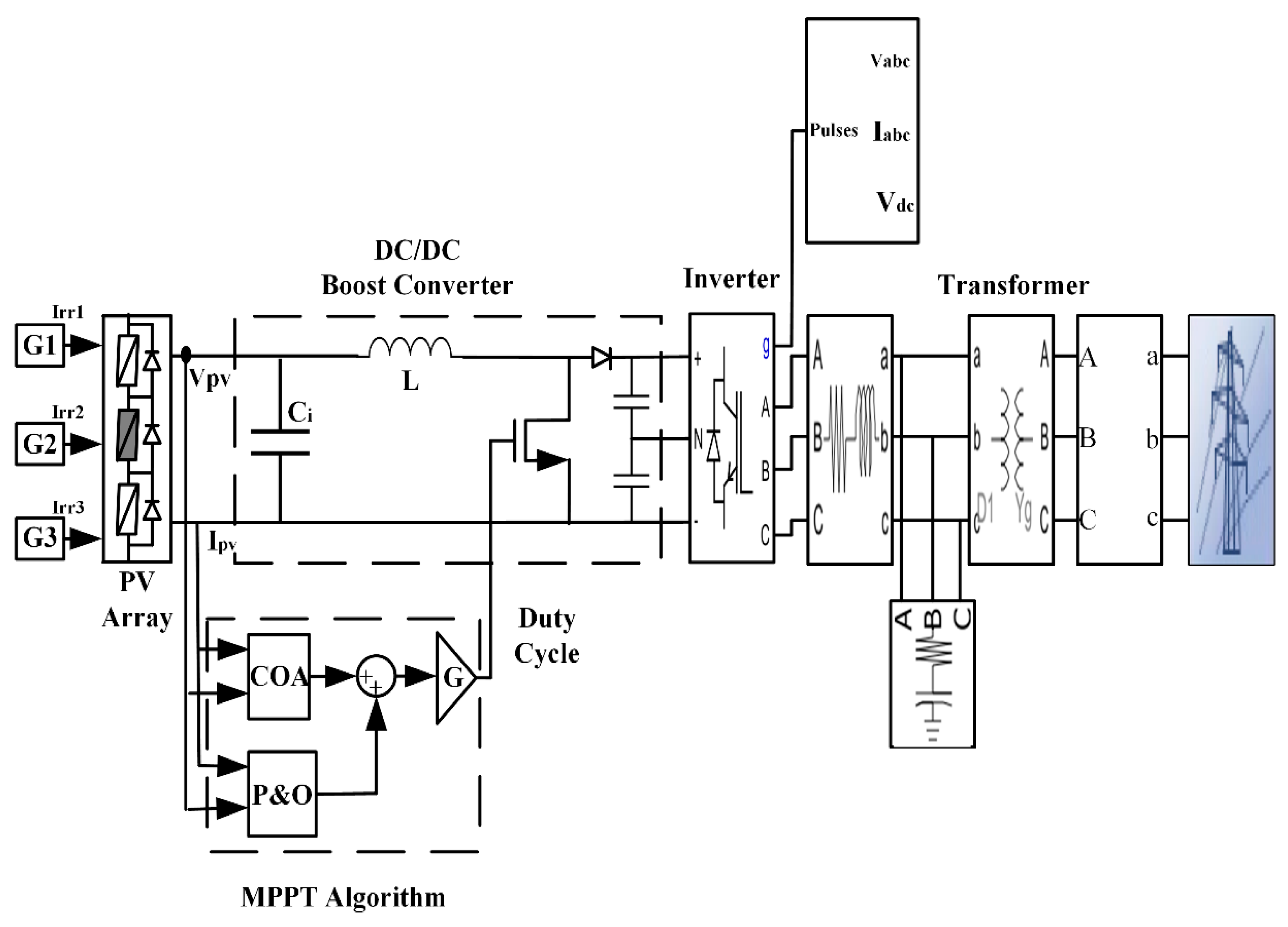 The PV system model consists of a PV array connected to the grid through a DC–DC converter, inverter, LC filter, and transformer. The schematic of the proposed configuration is illustrated in