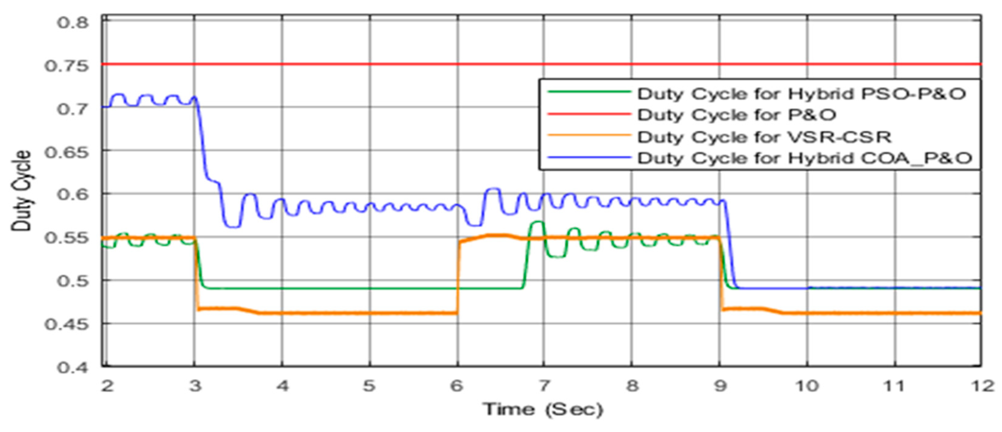 Figure 15, exhibit multiple peaks, clearly highlighting the effects of partial shading under non-uniform conditions and the resulting complex power distribution among the PV modules. The corresponding duty cycle variations for these conditions are illustrated in