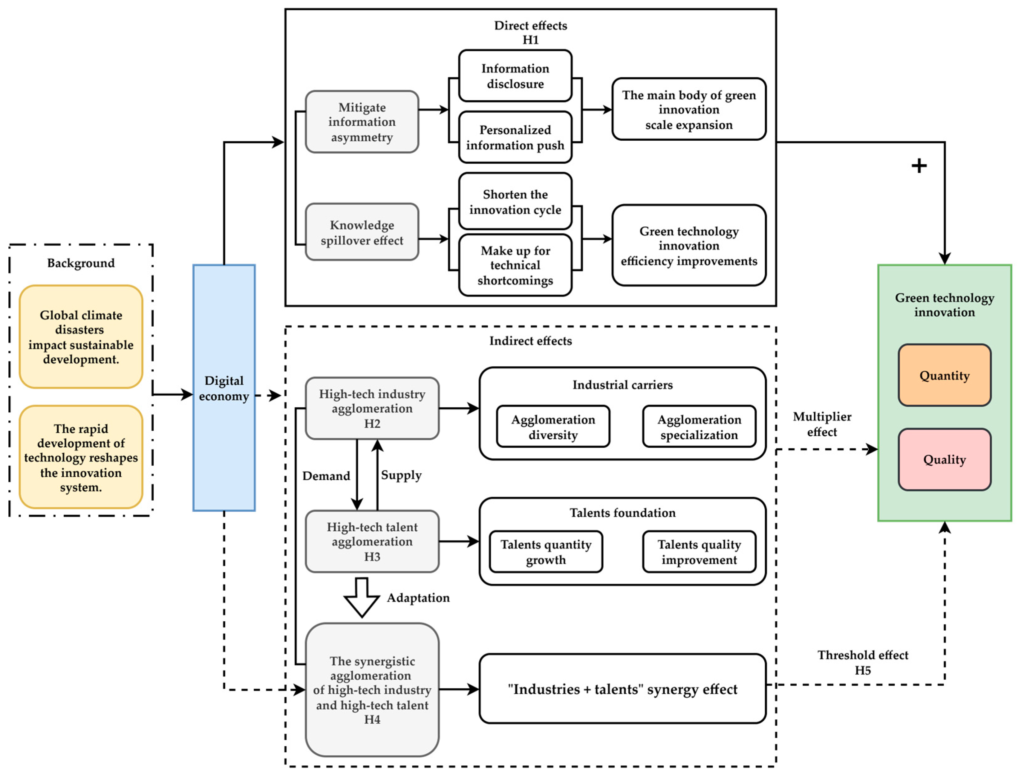 - Huang, X.; Zhang, S.; Zhang, J.; Yang, K. Research on the impact of digital economy on regional green technology innovation: Moderating effect of digital talent aggregation. Environ. Sci. Pollut. Res. 2023, 30, 74409–74425. [Google Scholar] [CrossRef] [PubMed]
