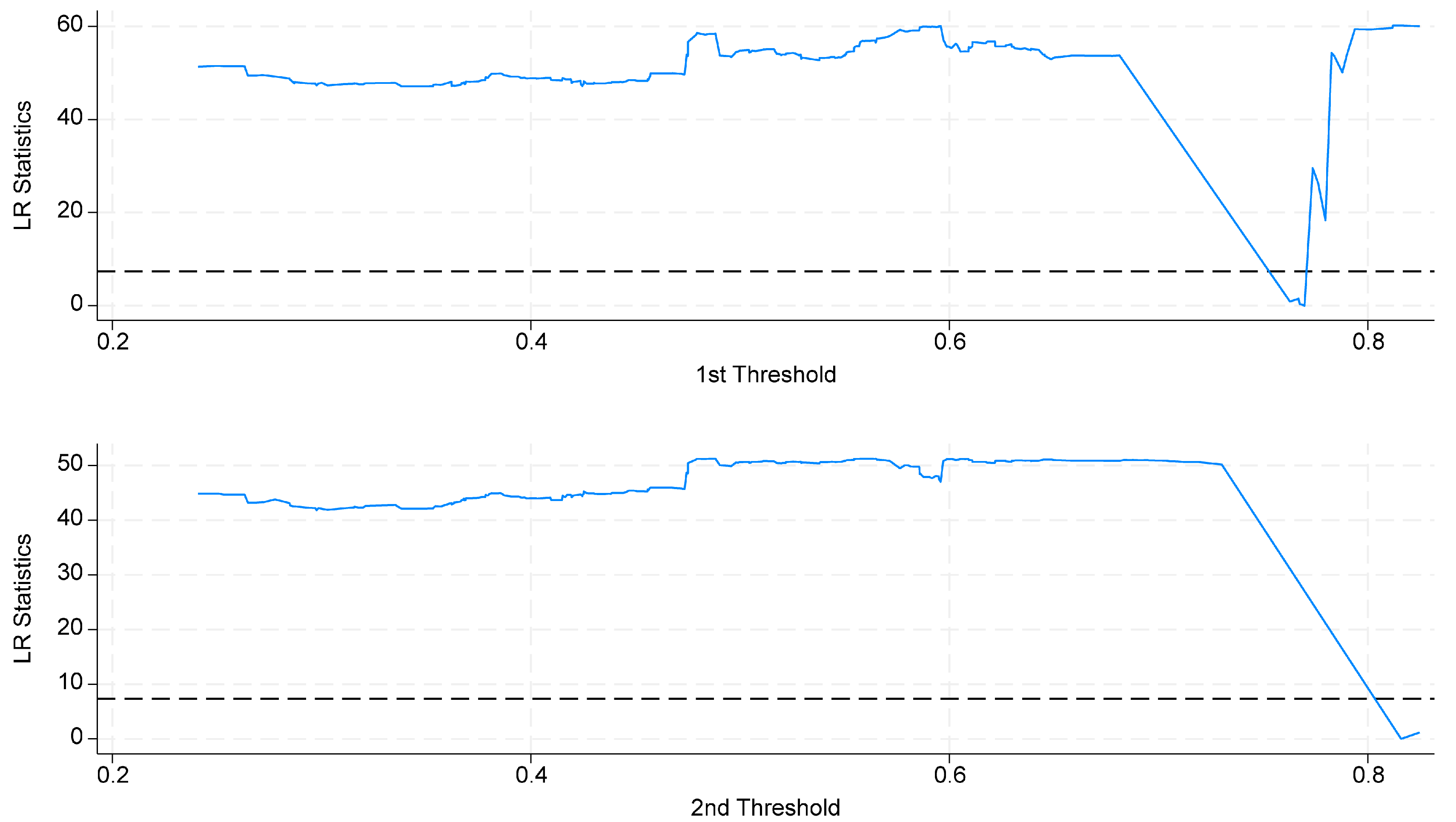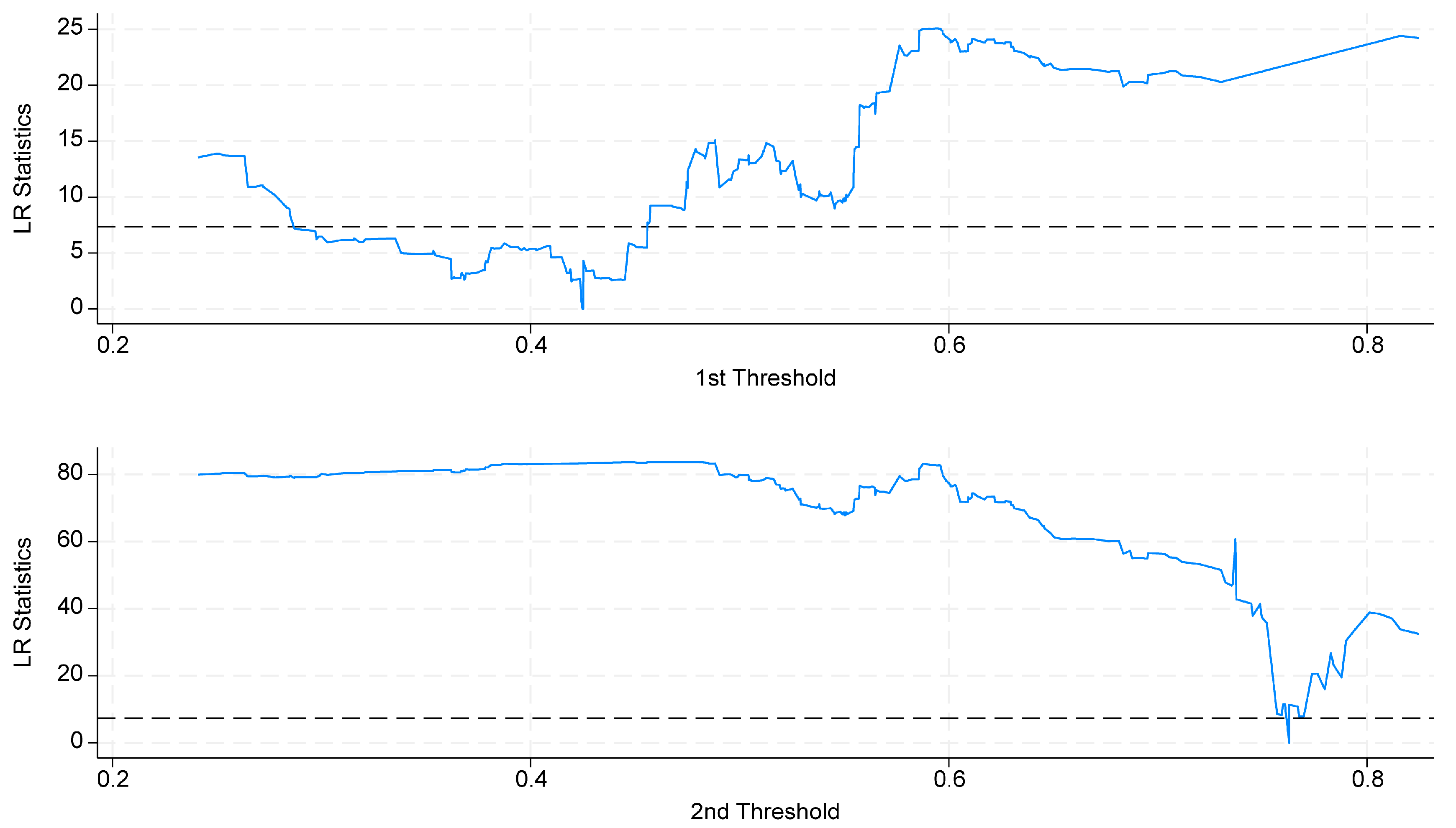 | Number of Thresholds | Threshold Value | F-Statistic | p-Value | |
