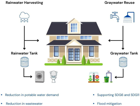Responding to sustainable development and climate change challenges, there is a drive to transition from traditional centralized water systems toward decentralized water strategies [16]. Among these, hybrid rainwater–graywater systems (HRGSs) have become increasingly interesting for improving urban water security, as shown in Figure 1. HRGSs assist in providing continuous non-potable water by implementing graywater reuse (GWR) and Rainwater Harvesting (RWH) into an urban system, to lower reliance stress on municipal networks [17]. These systems are not only capable of enhancing potable supply but also reducing pressure on sewage infrastructure by intercepting household graywater, thereby minimizing wastewater generation [18,19]. RWH contributes to flood mitigation by managing runoff volumes, while GWR sustains water availability during periods of low rain precipitation. When strategically used in residential and commercial buildings, HRGS have been shown to reduce potable water demand by up to 42% [20,21], aligning directly with Sustainable Development Goal 6, which for access to clean water and sanitation, and Sustainable Development Goal 11, which promotes sustainable cities and communities [22,23].