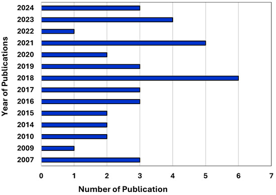 An analysis of the publication years shows that 2018 is the highest number of studies, with six publications, as illustrated in Figure 5. This was followed by 2021 with five publications and 2023 with four. The years 2024, 2019, 2017, 2016, and 2007 each conducted three publications, indicating equal interest during these periods. Meanwhile, 2020, 2015, 2014, and 2010 each contributed two publications, and the lowest counts were observed in 2009 and 2022, with one publication each. Overall, the data suggests a growing research trend in recent years, with a notable peak in 2018.